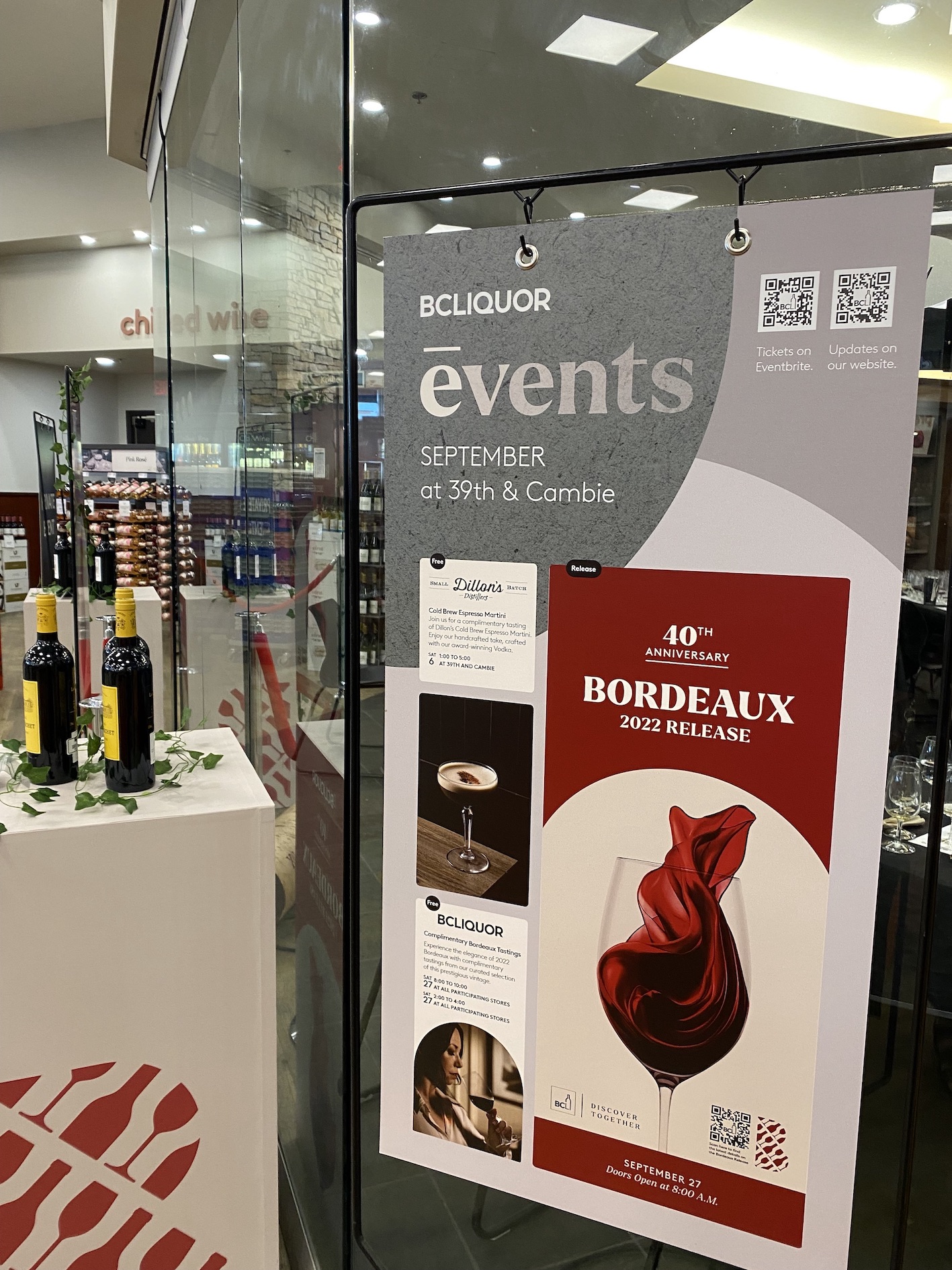 自1985年起始,BC Liquor Stores(BCLS)每屆金秋必有Bordeaux Release年度發布會,推出上百款頂級法國波爾多佳釀,引得酒客哄動劉伶搶購,今年9月27日舉行的Bordeaux 2022 Release剛好步入40周年,酒房裡一早張掛標示提醒一眾愛酒人士屆時請早。