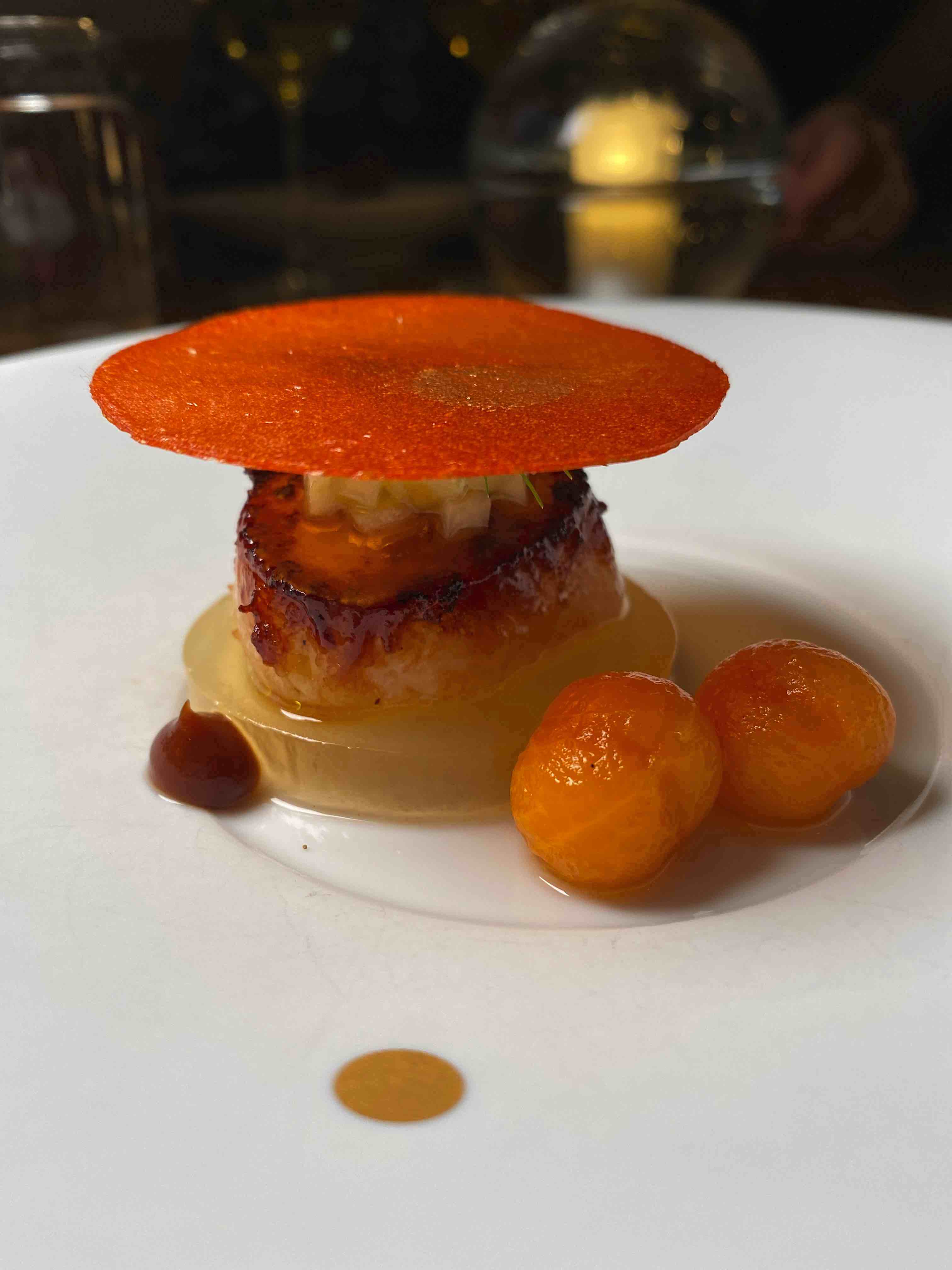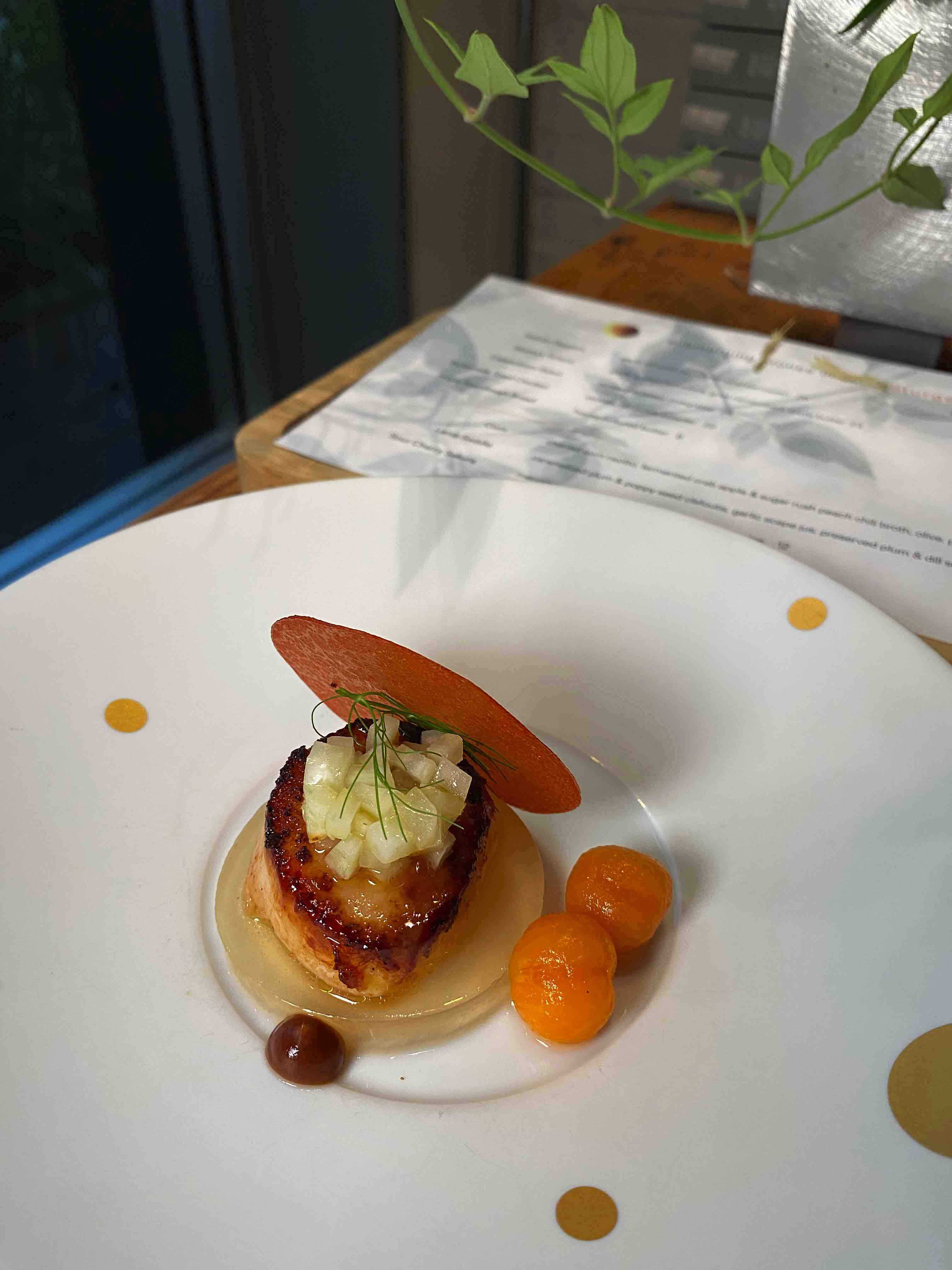 我品賞的是八、九月的植物主題,以彰顯夏日的豐饒和豐收的喜悅。何故以鱘魚月為名,因為Algonquin原住民觀察到在這段時間,鱘魚最容易在五大湖和附近的河流中被捕獲。餐單中有新採收的玉米、番茄、帶子和海膽等,均以意想不到的廚藝手法呈現眼前,並以太平洋西北地區的視角進行了重新詮釋,在在讓人驚艷。