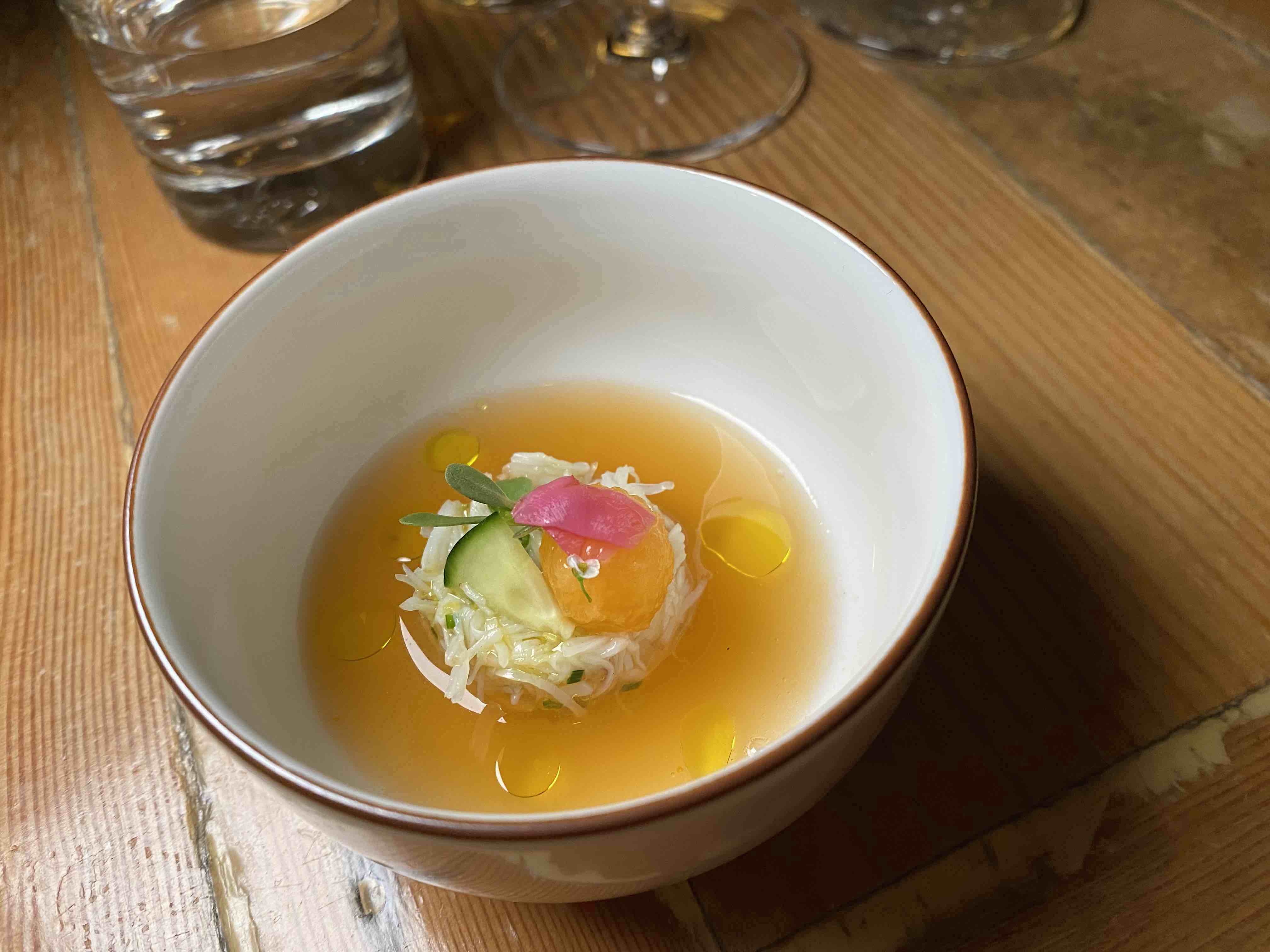 Dungeness crab是以鮮蟹拆肉壓成餅狀,和青瓜片及一小束馬齒莧(purslane)一齊置入以法國小蜜瓜和富含維生素C和抗氧化物的野生Nootka rose玫瑰果及花瓣煮成的高湯之中。珍寶蟹肉鮮味固不待言,而這高湯的鮮甜處有過之而無不及,甚至更形出采。