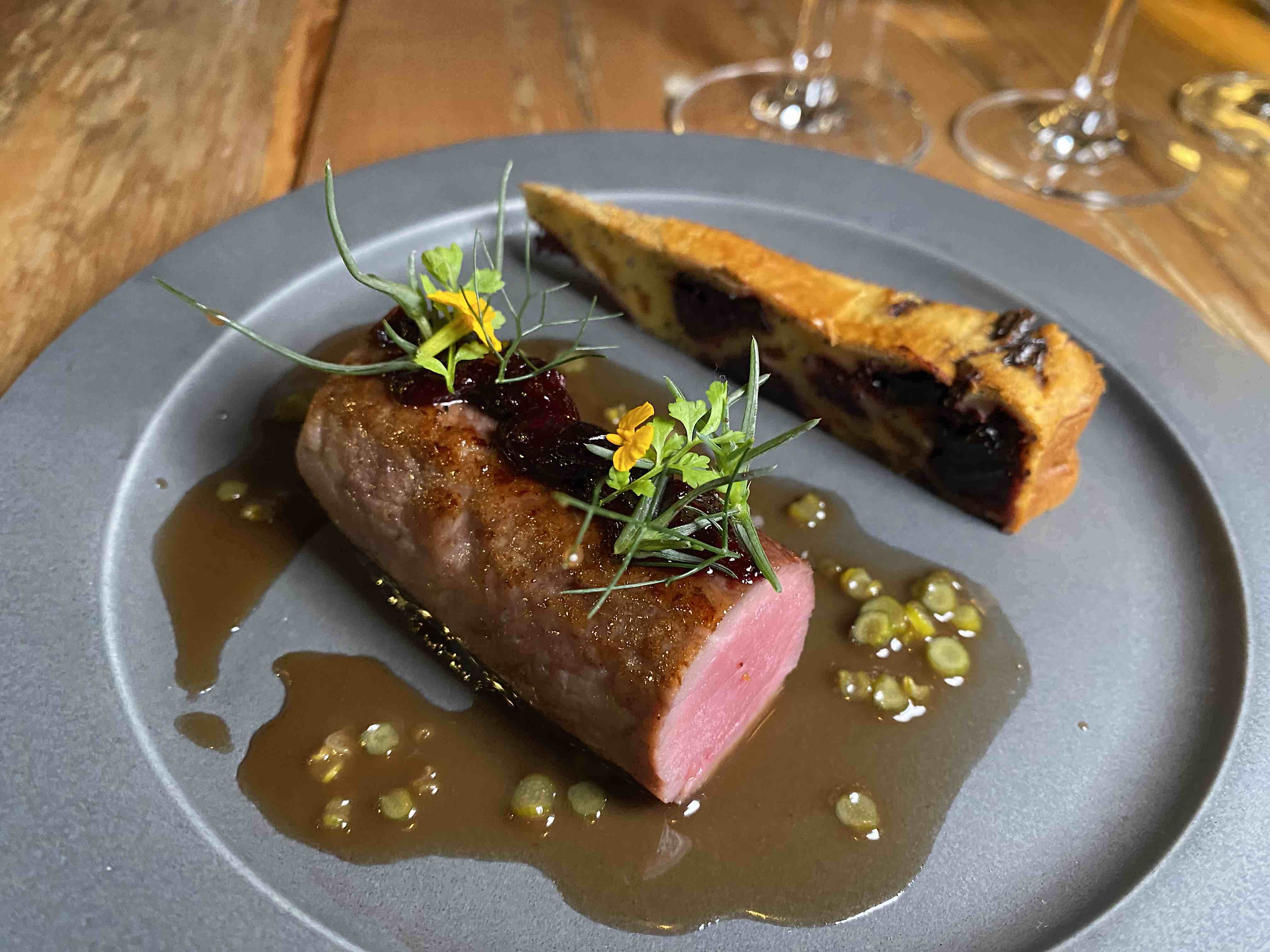 這羊鞍烤至半生,口感份外鬆軟香滑,上置甜甜的preserved plum & dill seed compote以鮮活葷香;一旁配搭法式餡餅clafoutis,餡餅裡的焦糖李子乾及罌粟籽顯得微甜而不膩,和加於羊鞍的蒜薹粒及蒜薹汁(garlic scape jus)組成了鹹甜互搭的妙配。