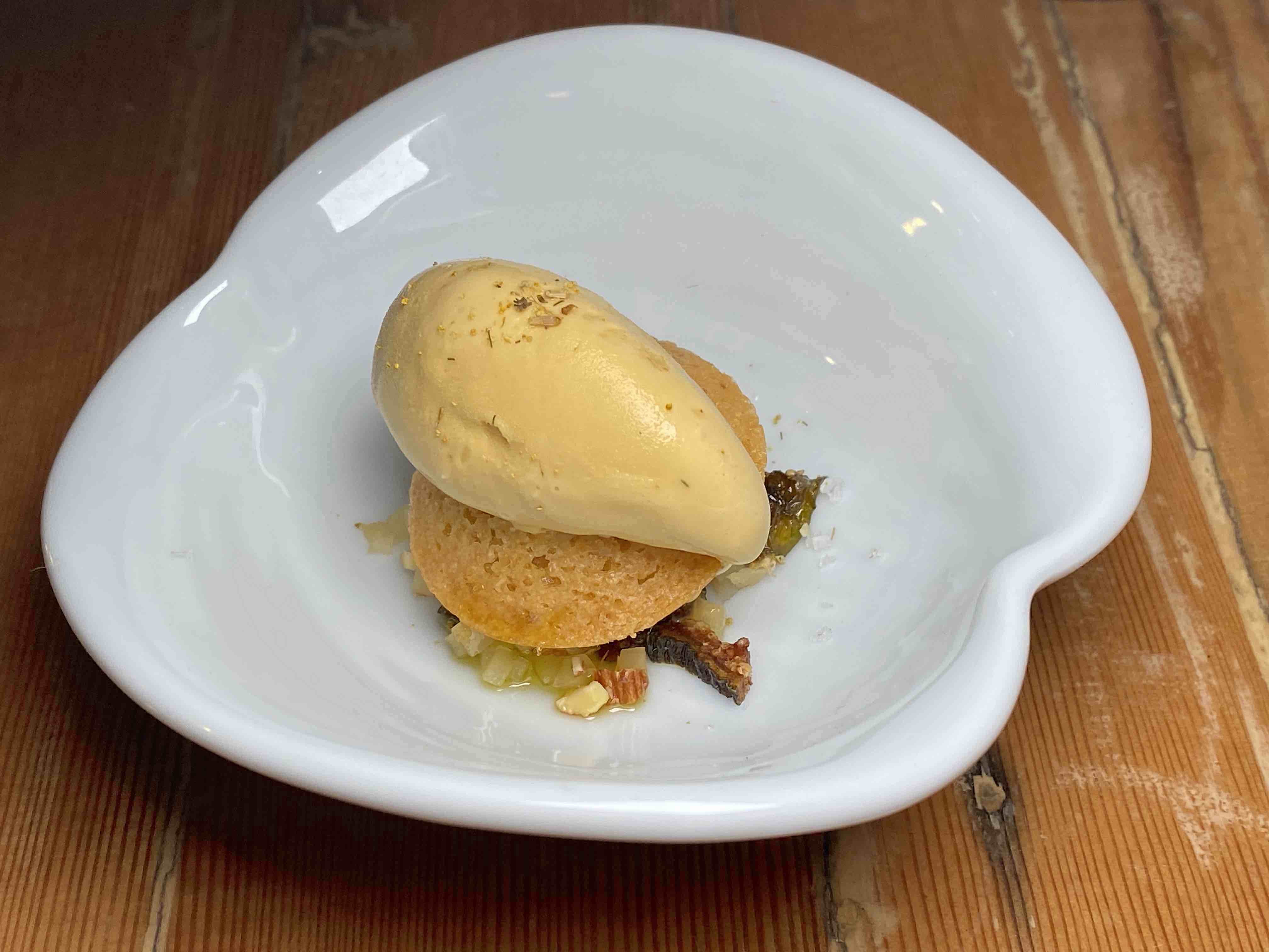 最出人意表的食材應數那加於uni gelato裡的本省紅海膽籽,配搭香脆的蜜餞杏仁、軟糯的燉牛蒡和無花果、茴香花粉,再澆上帶點胡椒餘味的Creanza olive oil,為你送上層次感一浪接一浪的飯後一點甜;而且我一向以為牛蒡只用於鹹味菜肴,原來和甜點相襯更帶來不一樣的earthy草根風味。