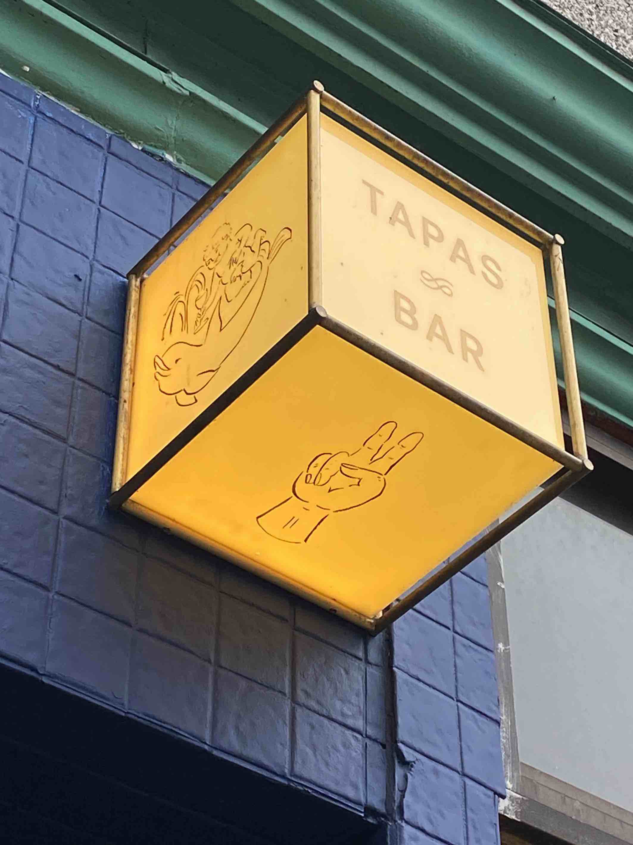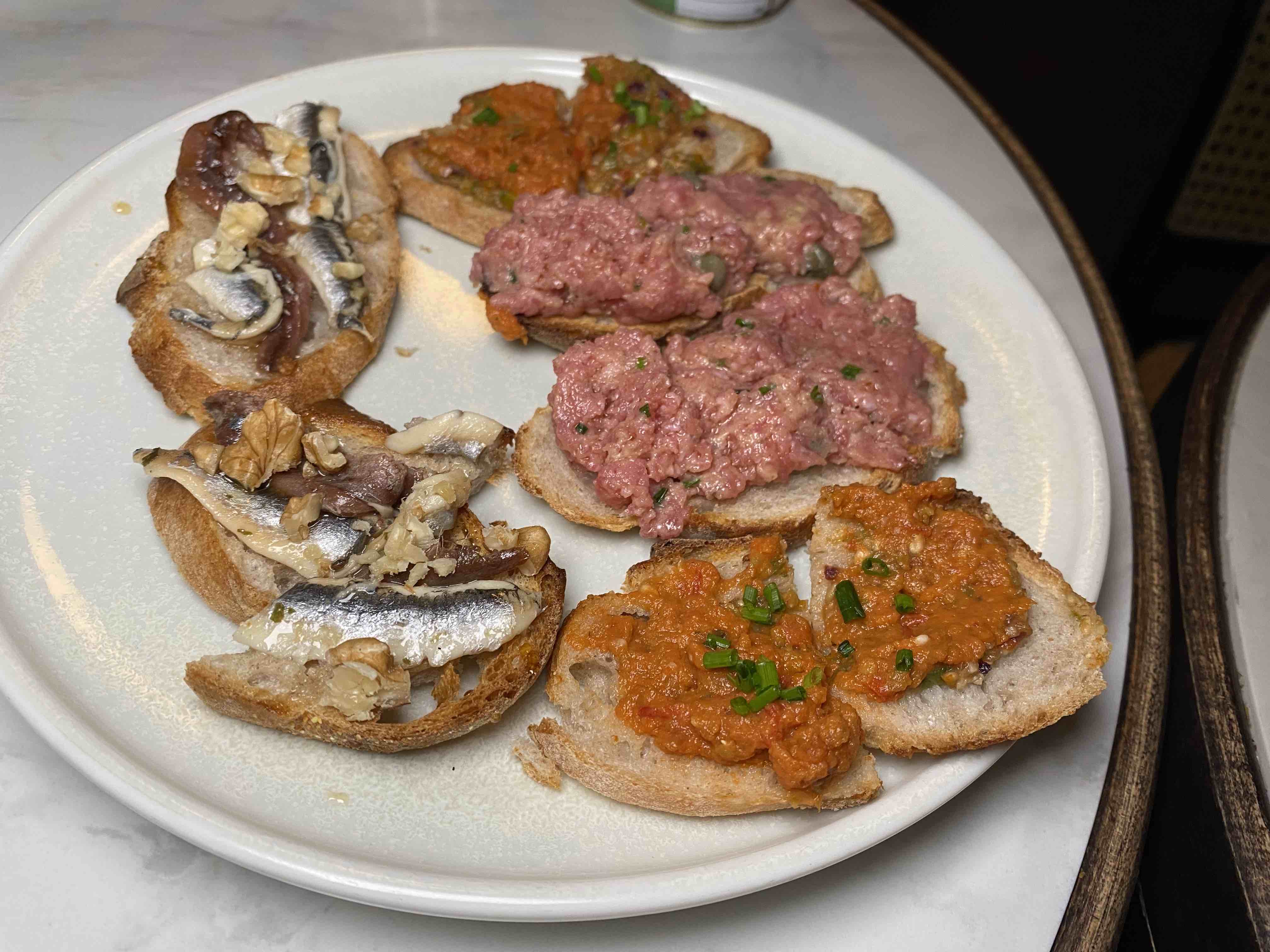 地中海最經典開胃小菜可以是麵包上的鹹鱈魚、火腿、肉丸、烤香腸、醋漬小椒、鯷魚或酸漬小鱆魚等簡單食材,不求擺盤只問滋味,正是典型小酒館的原始且豪邁風格。這裡有加了蒜粒的pan con tomate、拌有蜜糖和合桃的anchovy及西班牙辣腸配橄欖油等。