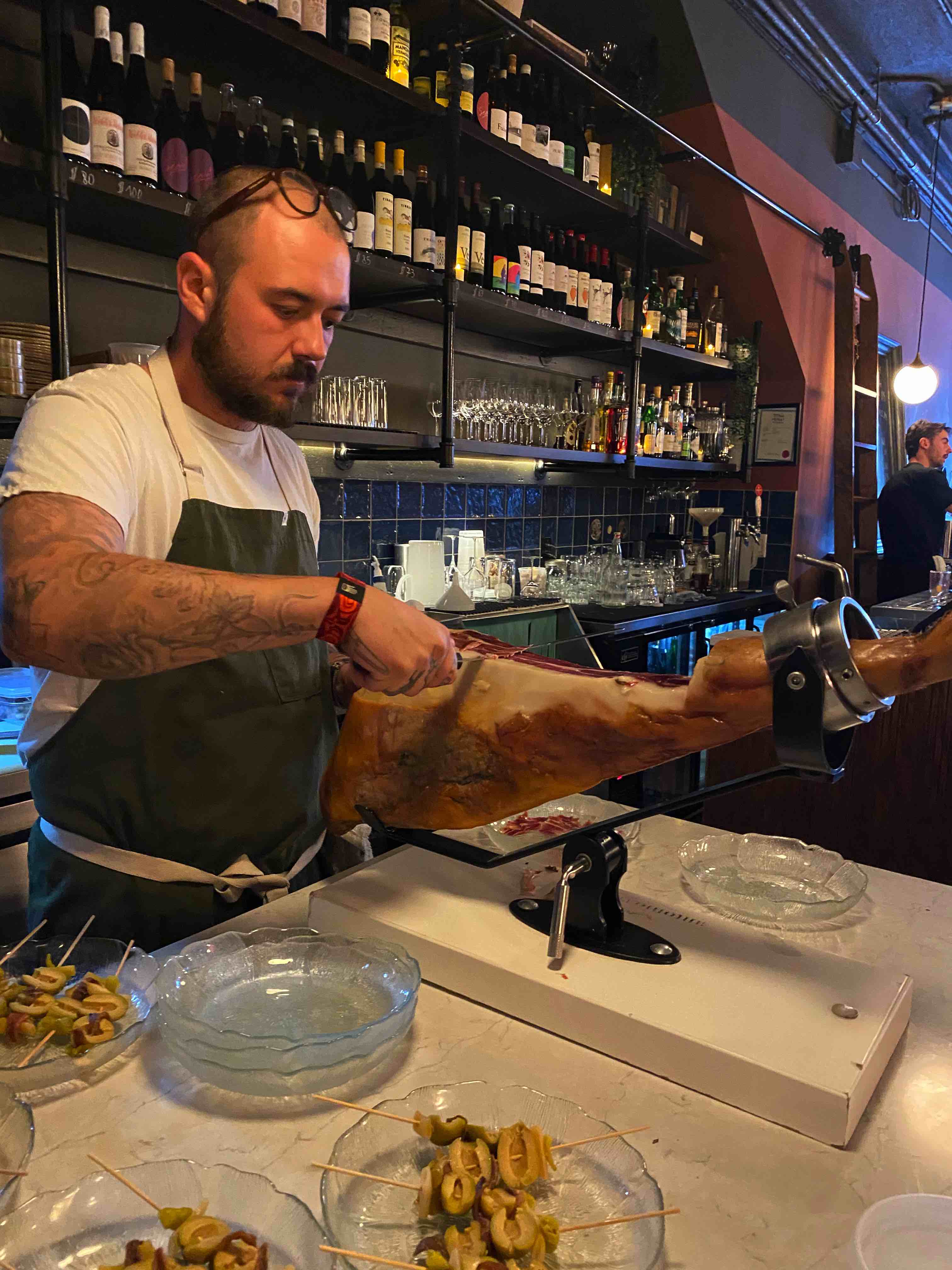 我的必然精選自然是吃橡實長大的西班牙伊比利亞半島黑毛豬火腿Iberico jamon,以海鹽手工醃製然後窖藏於地窖中三數載,在自然環境下風乾。再加上火腿經過專業訓練的手工切割技巧,切成薄片的口感有如絲緞般柔滑,構成了肥瘦相間的大理石紋,擠上了少許Intosso olive oil,入口甘香,隱隱然帶有果仁風味,真箇是百吃不厭。