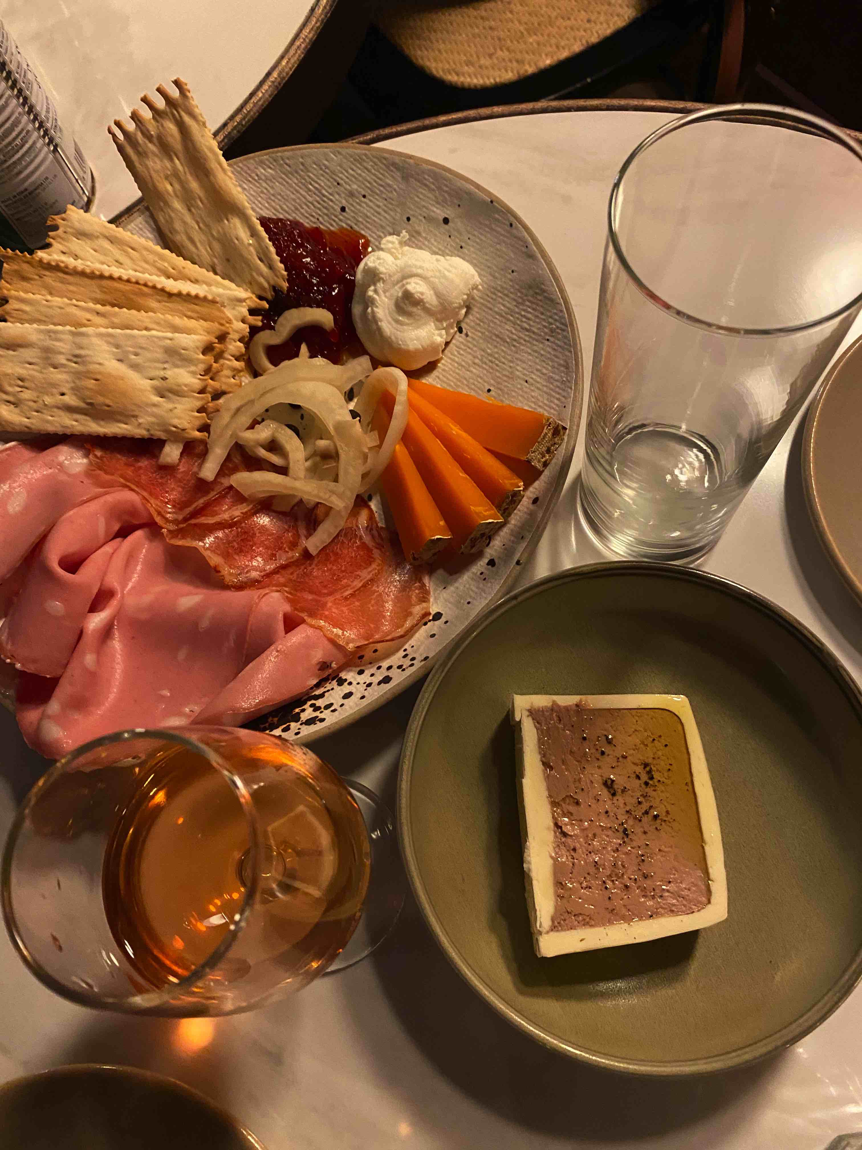 熟食併盤(charcuterie platter)的凍肉類有意大利火腿mortadella和bresaola、法國saucisson肉腸、西班牙辣腸Iberico chorizo與Iberico jamon及本地品牌Le Petit Chapeau製作的雞肝凍(chicken liver parfait)。