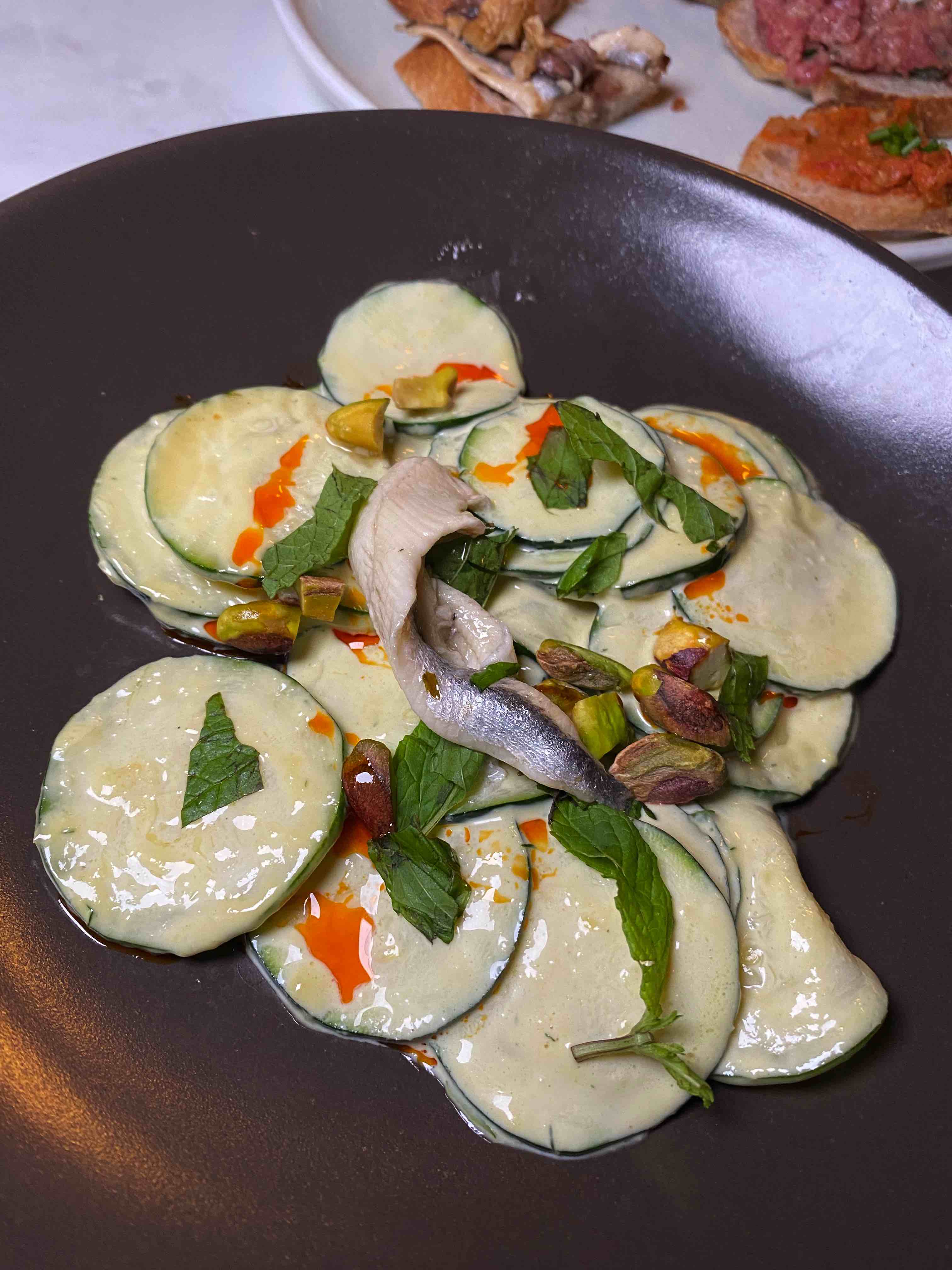 這裡則另有安排,總廚把青瓜薄切後以醬汁預先拌好,然後碟中加入鯷魚、開心果、薄荷及Calabrian chili等,讓你自家拌勻來吃。