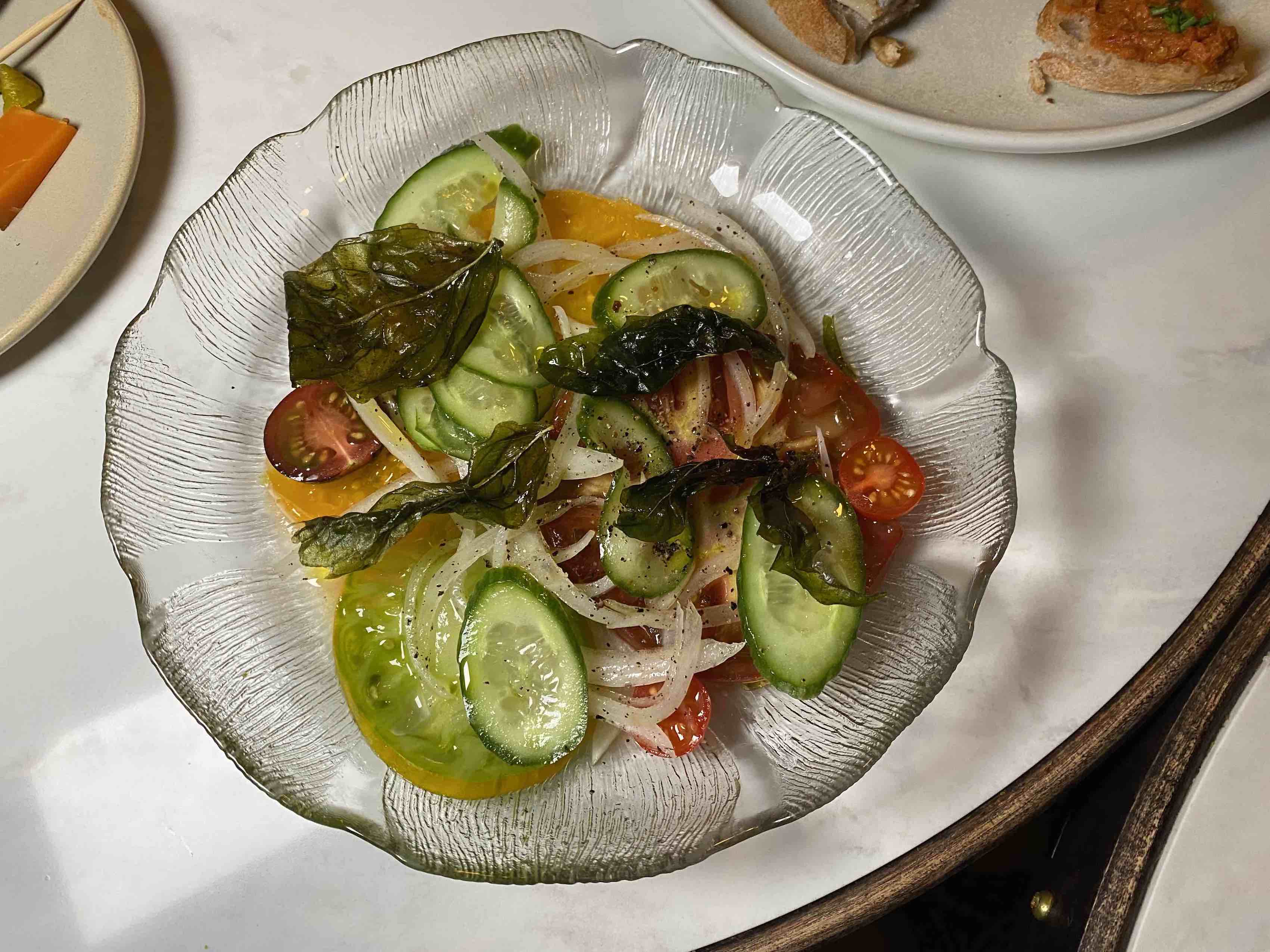 Tomato carpaccio最是清鮮,把walla walla onion切絲, 配搭酸漬青瓜及炸脆羅勒葉,烘雲托月似地呈現heirloom tomato的甜熟之美,當然,甜酸醋汁的美味自然亦是功不可沒。