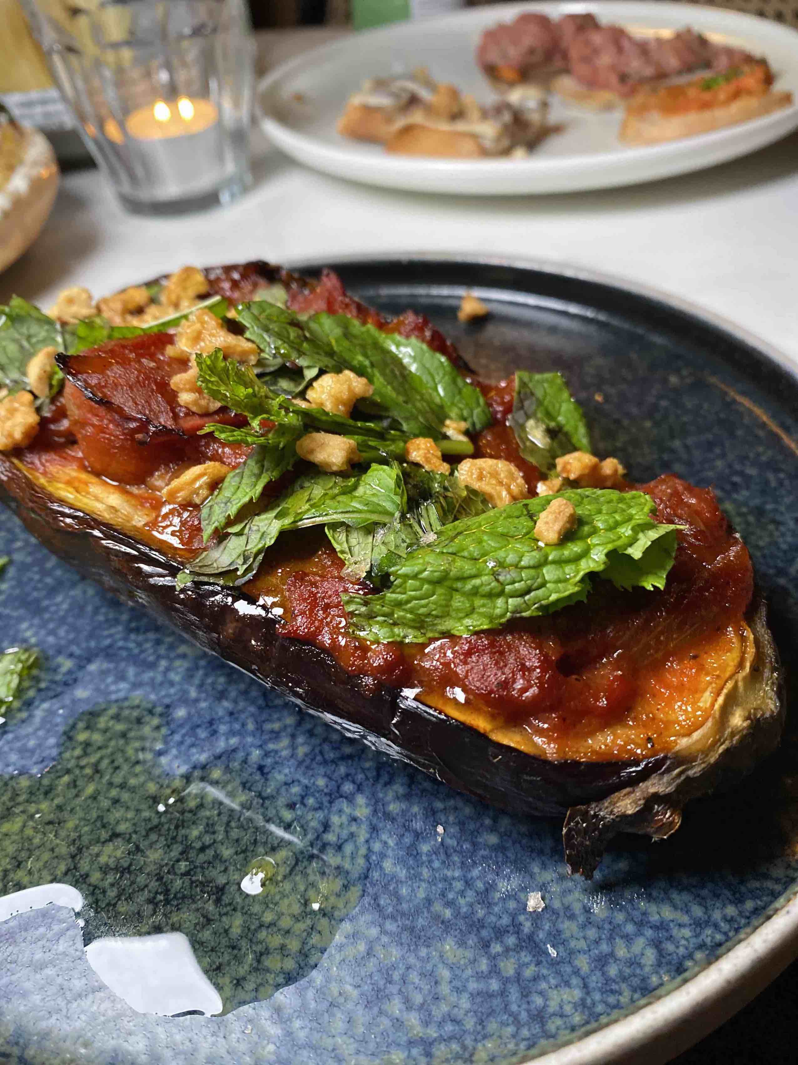 Imam bayildi這道希臘菜背後有故事:話說一位鄂圖曼帝國的土耳其官員妻子向丈夫投訴說,做這道菜讓她昏倒了,因為幾乎用完了所有的橄欖油。可見茄子的吸油大法有如海綿,何等讓人咋舌;不過,總廚在炮製用油量使人昏倒的茄子時避重就輕,縱切成塊後燒至焦脆而不用油炸,再把切丁炒過的洋蔥、金蒜等各式填料鋪面,最後加入spiced tomato ragù醬汁,讓微辣中和了膩感。