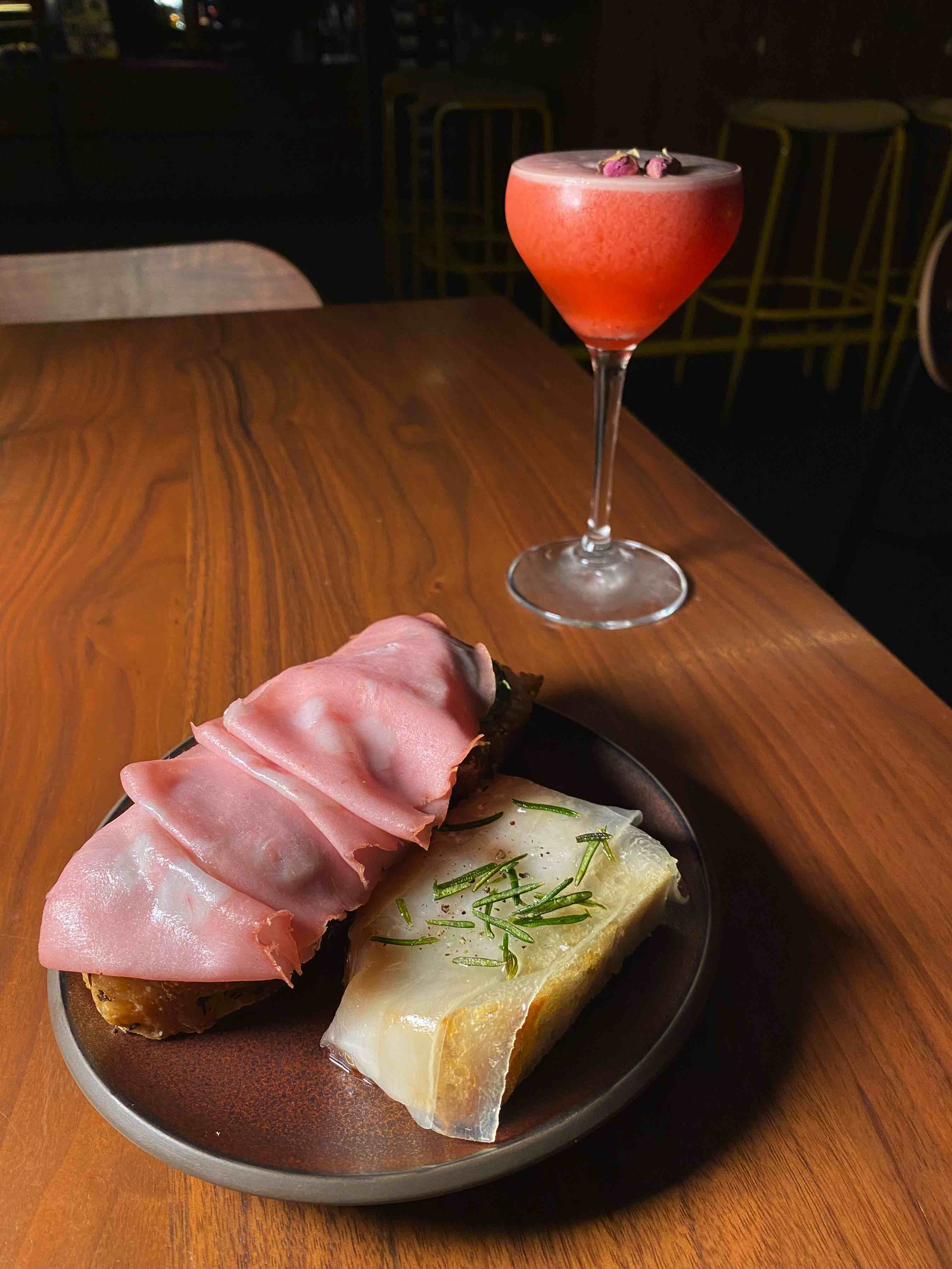 碟中右邊的正是sourdough & lardo,是店內必試cicchetti。 唯其夠薄,因此這片lardo可以在很短時間內於口腔中溶化開了,滲出的脂香和塗在其上的蜜糖水乳交融,甘鹹而又甜味的踫撞之外更加有炸過迷迭香的草本氣息。當我在怦息享受時,Chef Chanthy還補上了一句:「這是我在威尼斯一家拐角小酒館吃到的,我立馬就知道我要把這列在餐單中了!」