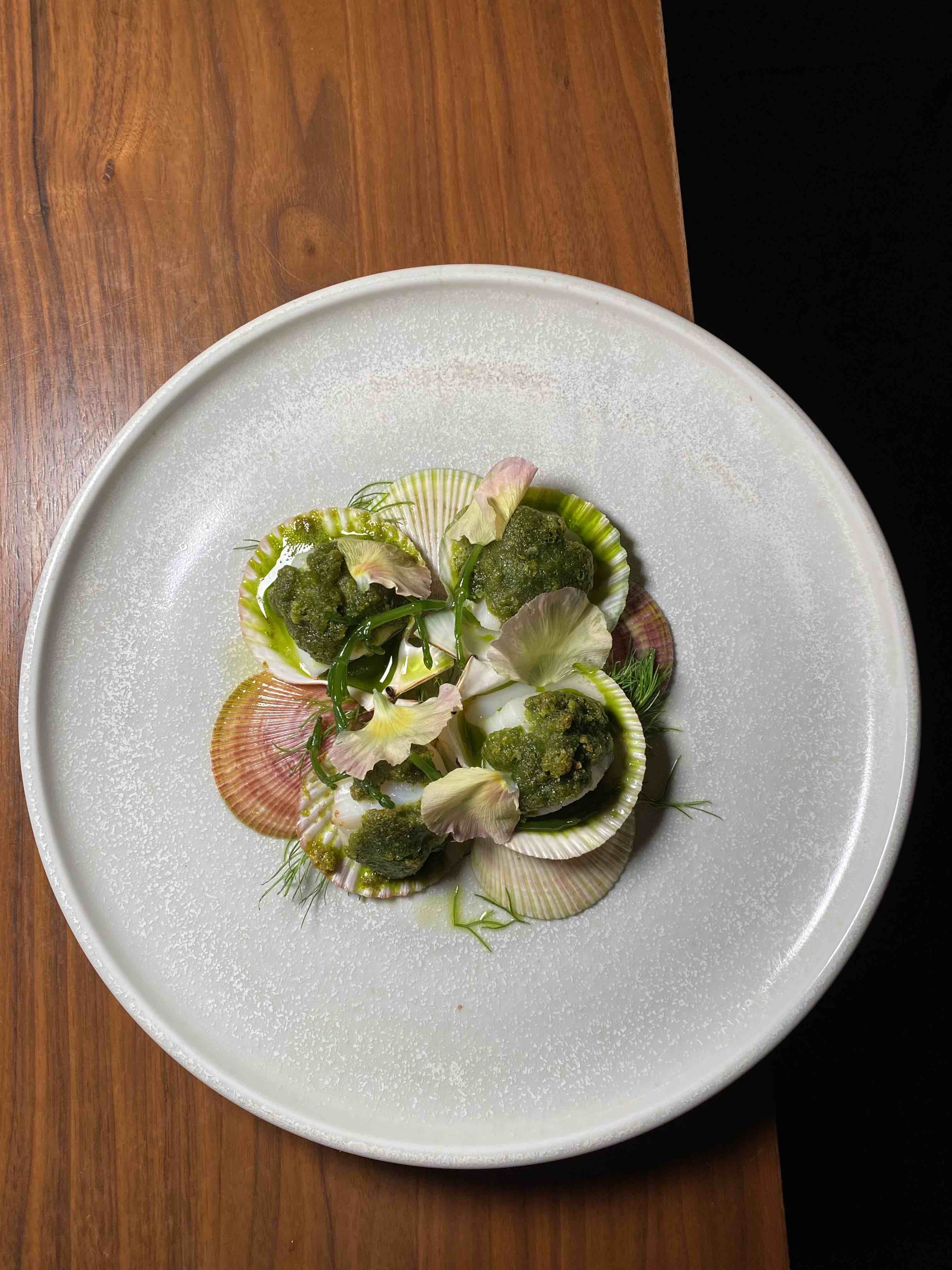 Baked wild BC scallops配搭parsley butter及牛油果鯷魚醬(anchovy gremolata)佐味。