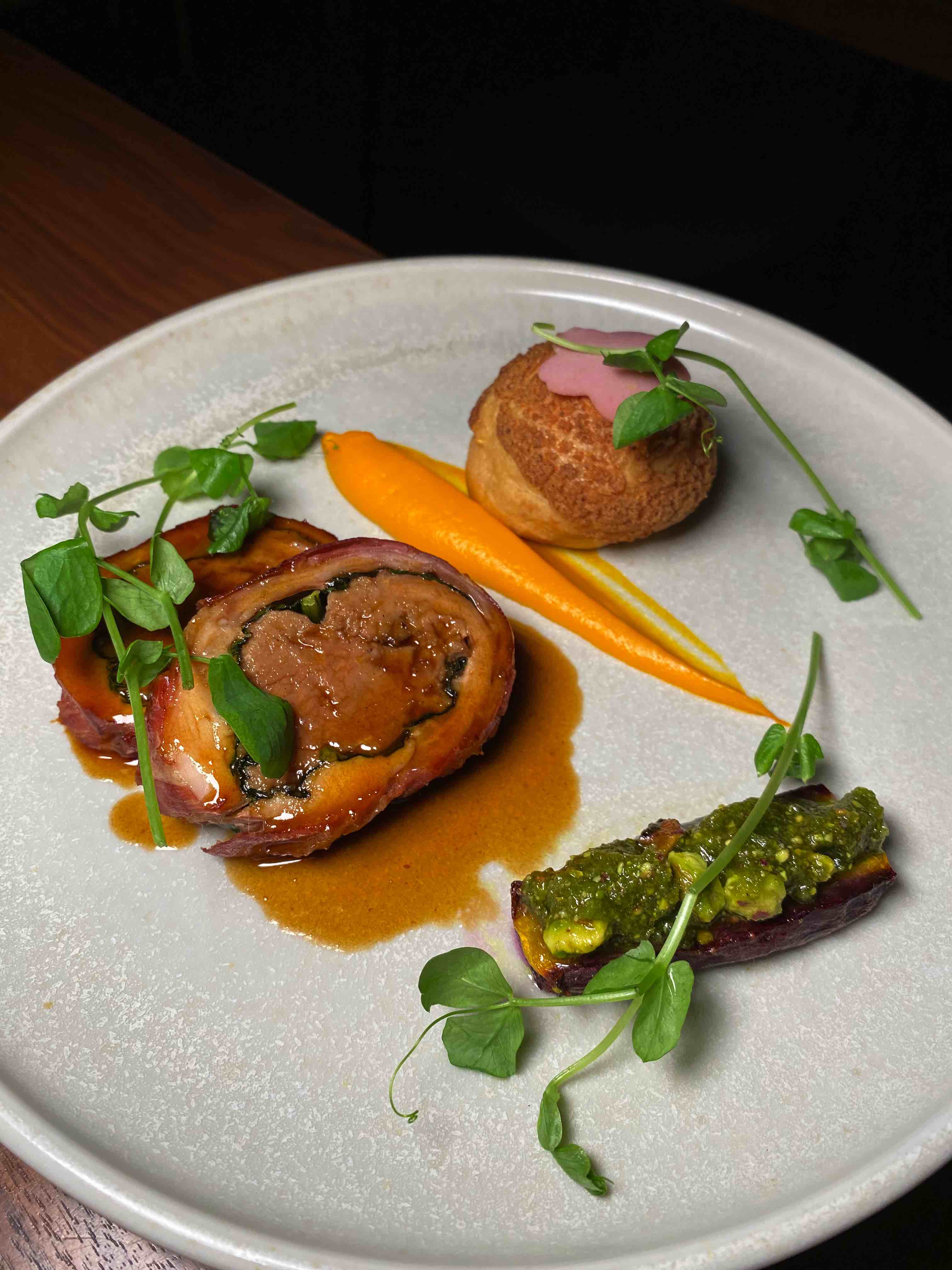 Stuffed rabbit wrapped in prosciutto是將兔肉包裹在煙肉裡捲好焗香,伴碟有紅蘿蔔、洋蔥紅蘿蔔茸(carrot soubise)、脆餅及加了蜜糖開心果茸裹以mortadella ham的方塊酥。