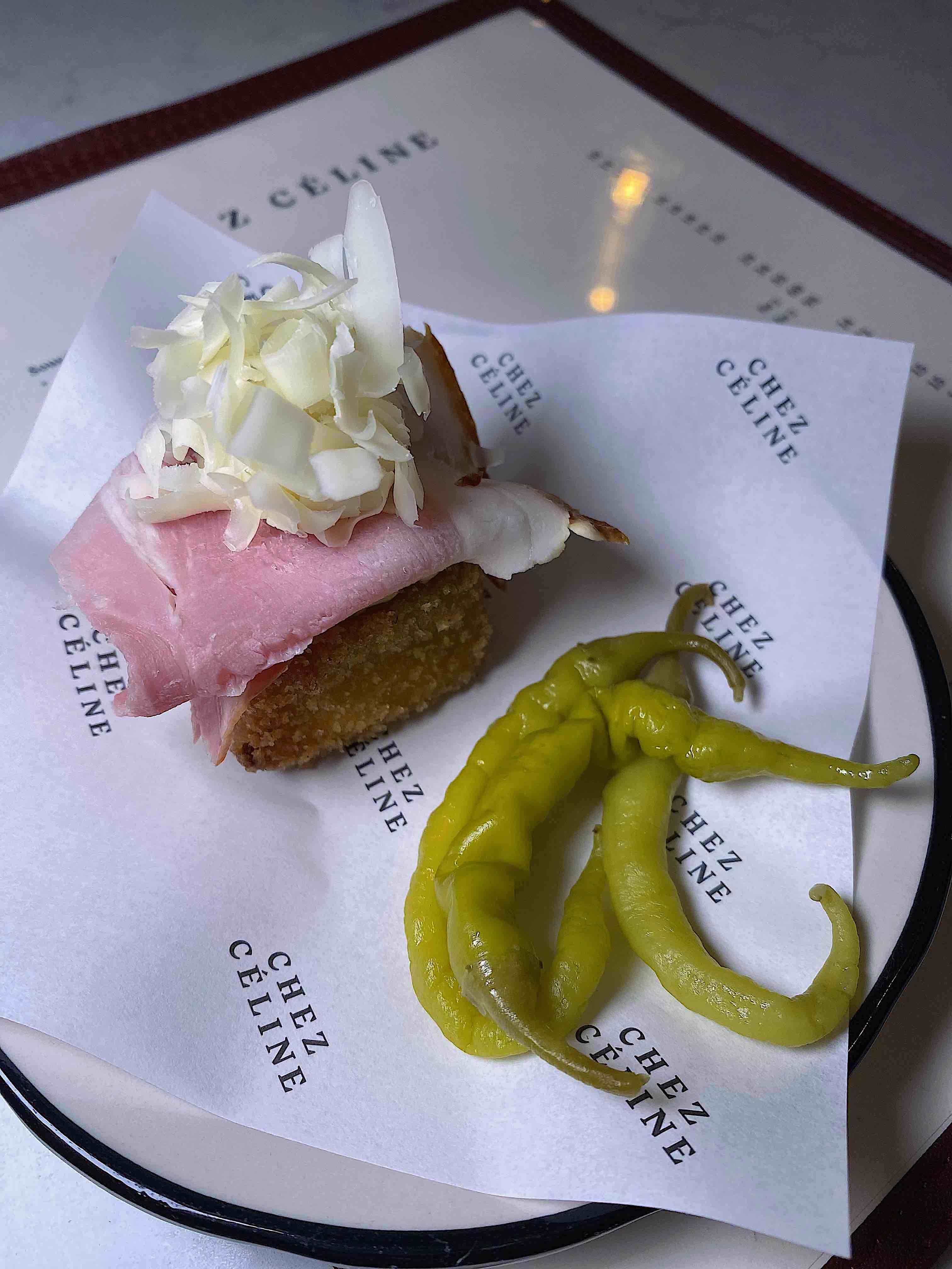 我形容之為簡潔版是因為主廚把原要烘脆的麵包演變成芝士薯茸炸丸子(croquette),然後上面放置火腿及芝士碎,使本來要動用到刀叉的菜式成了finger food,配搭泡漬青椒平衡風味。