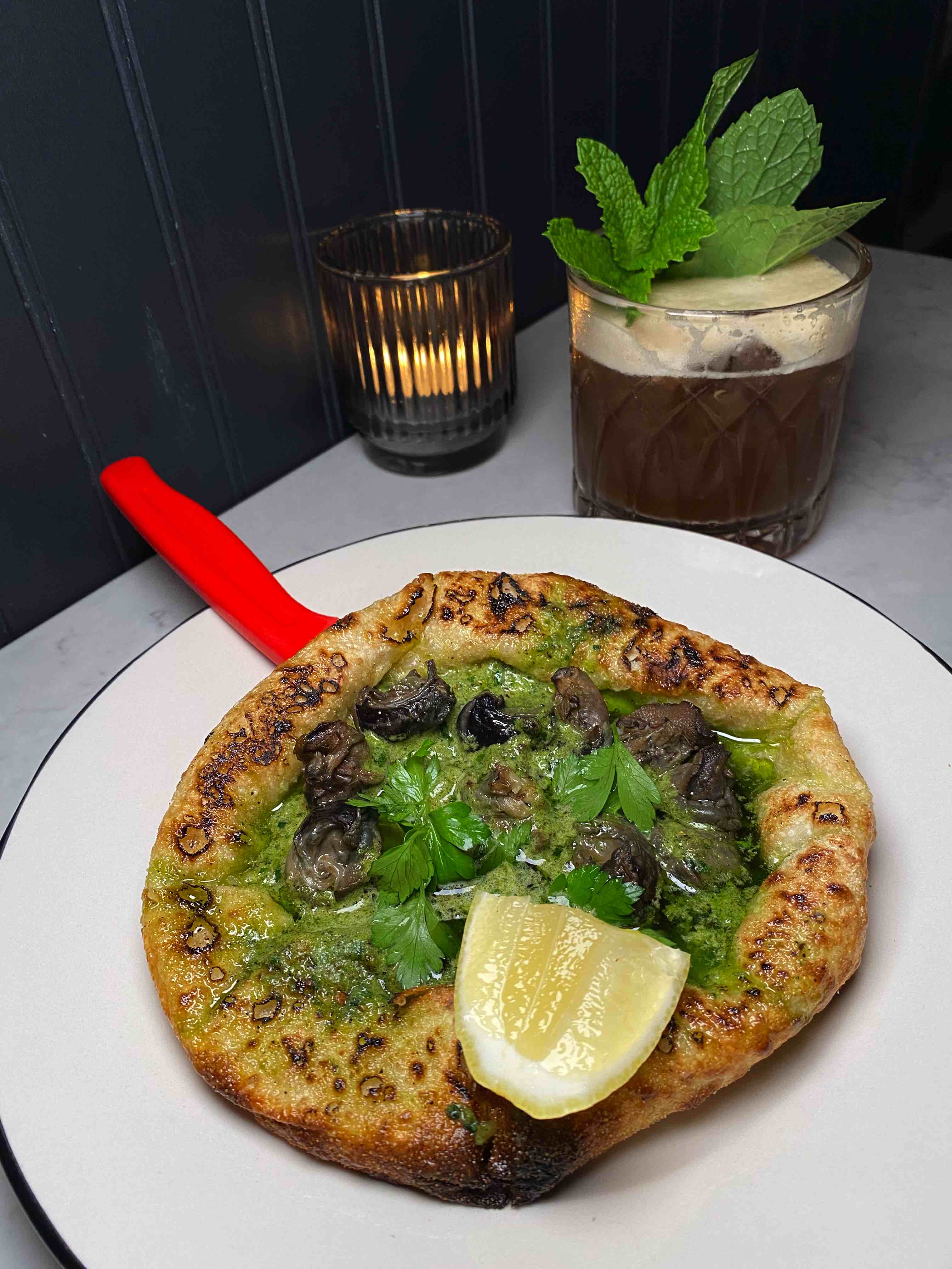我對傳統法式蝸牛印象一般般,因為蝸牛肉味不濃,主要依賴蒜香牛油(garlic butter)的惹味助攻,加上做法多是了無新意—— 然而這escargots + garlic butter卻另有創新,以酸種麵包作為薄餅基底,上置蝸牛及配味的多量蒜香牛油一齊烤焗,成為非一般的蒜香蝸牛薄餅,成為到此必點菜式。
