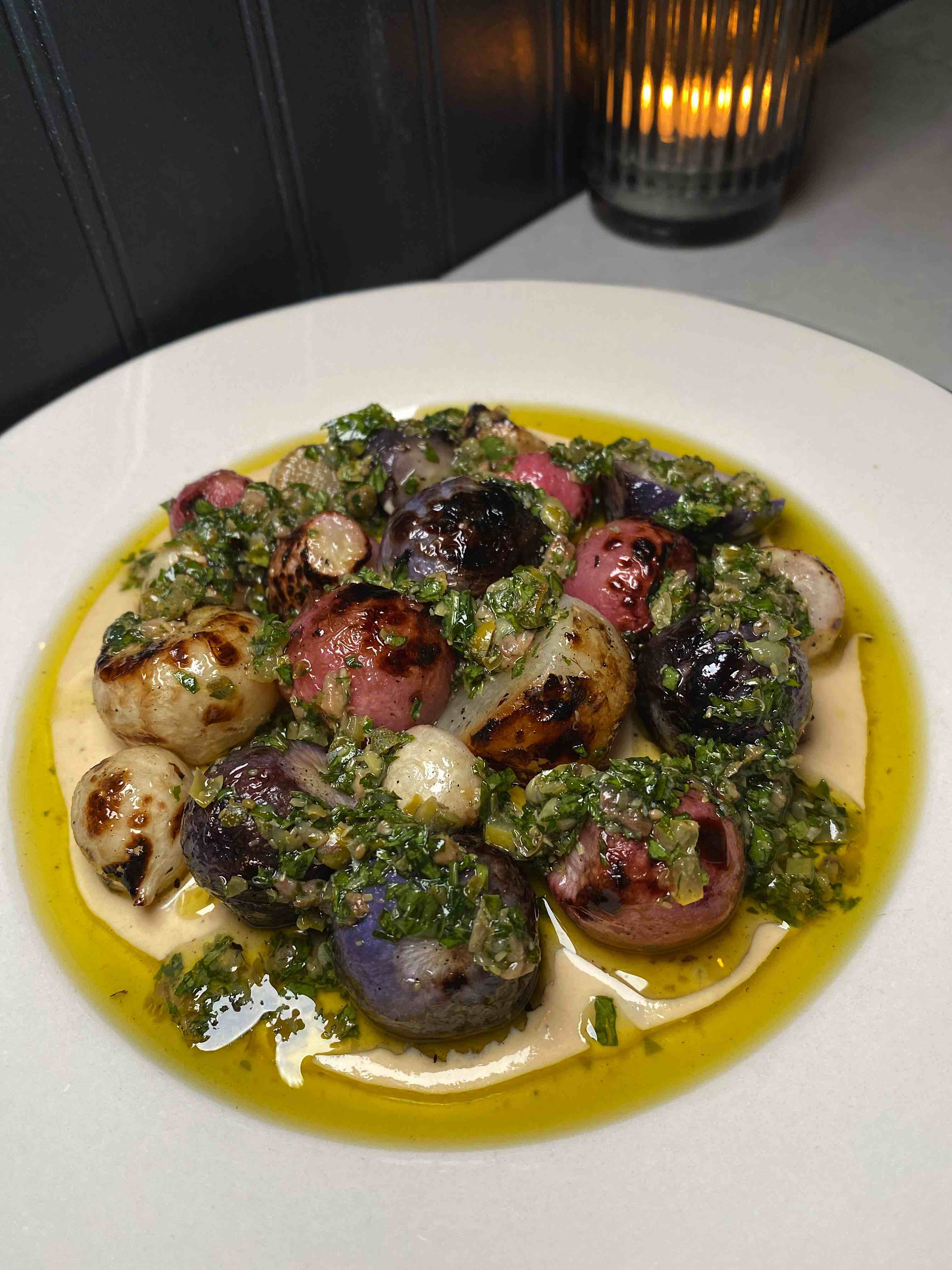 Charred radishes + sauce tonnato最懂得騙人,別以為全碟只用了炭燒水蘿蔔及櫻桃蘿蔔作為主角的菜式走清淡路線,沒想到小小蘿蔔粒下面的sauce tonnato才是狠角色:鹹香濃郁,順滑油潤,由吞拿魚、鯷魚、大蒜和酸豆帶來的濃郁風味,再由初搾橄欖油一統其成,調成了極為滋味稠厚的無敵醬汁。