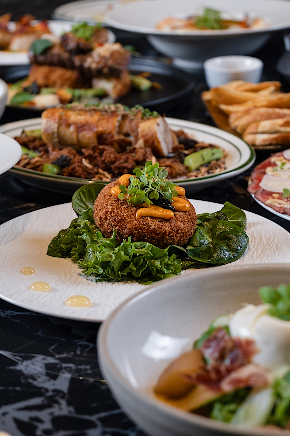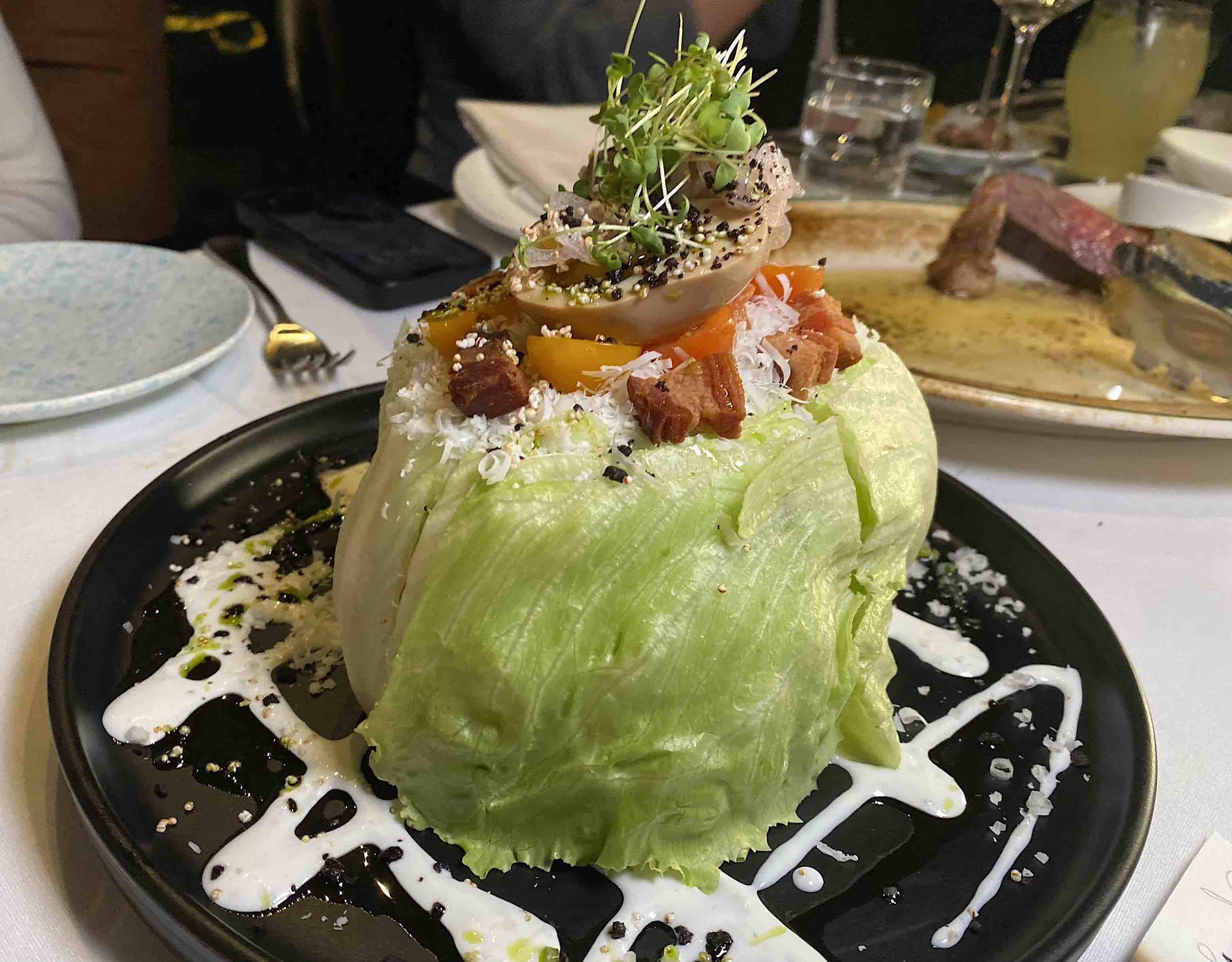 如果想點叫沙律的話,wedge salad是適合眾人分享的新口味:取最清鮮多汁的一大叢鮮嫩iceberg lettuce,上面加了溏心蛋、火腿粒、櫻桃茄、橄欖碎、 醃紅蔥頭、莧菜籽脆粒(puff amaranth)和Pecorino Romano芝士碎,再以Horseradish Buttermilk Ranch沙律醬在碟面劃花作調味,讓食客自行切碎生菜,好像吃年菜「撈起」一樣調勻各種鹹鮮酸甜等食材,充滿了玩味和食趣。