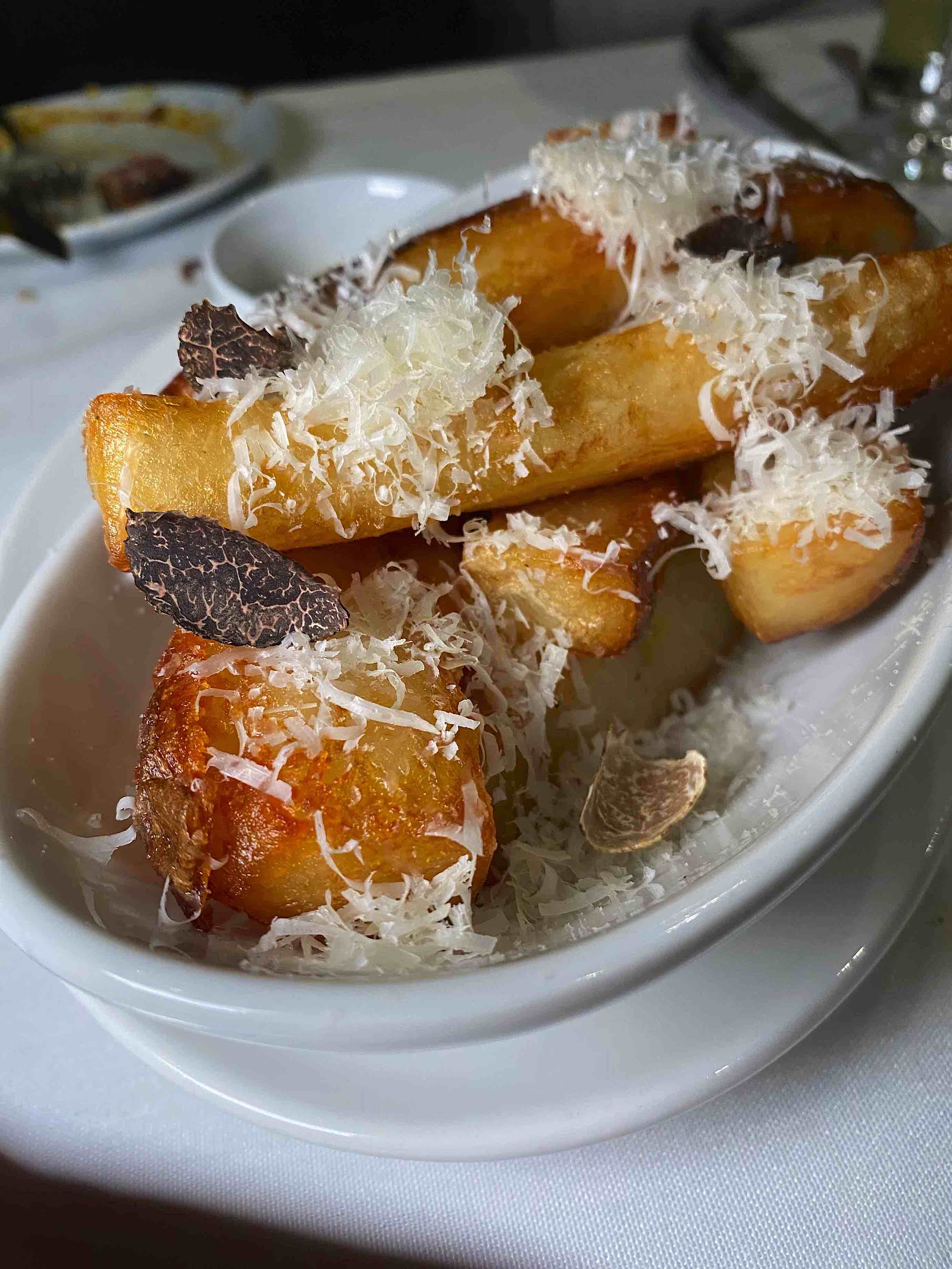 由於薯塊要經過三次烹調烤烘,故特意取色澤較淺的Russet Gold馬鈴薯來處理,厚切後烤至外皮酥脆,呈現淺金褐色,達至外層金黃酥脆,內部蓬鬆柔軟的口感。再加Parmigiano Reggiano芝士碎、松露蛋黃醬及削上黑松露作奢華點綴。