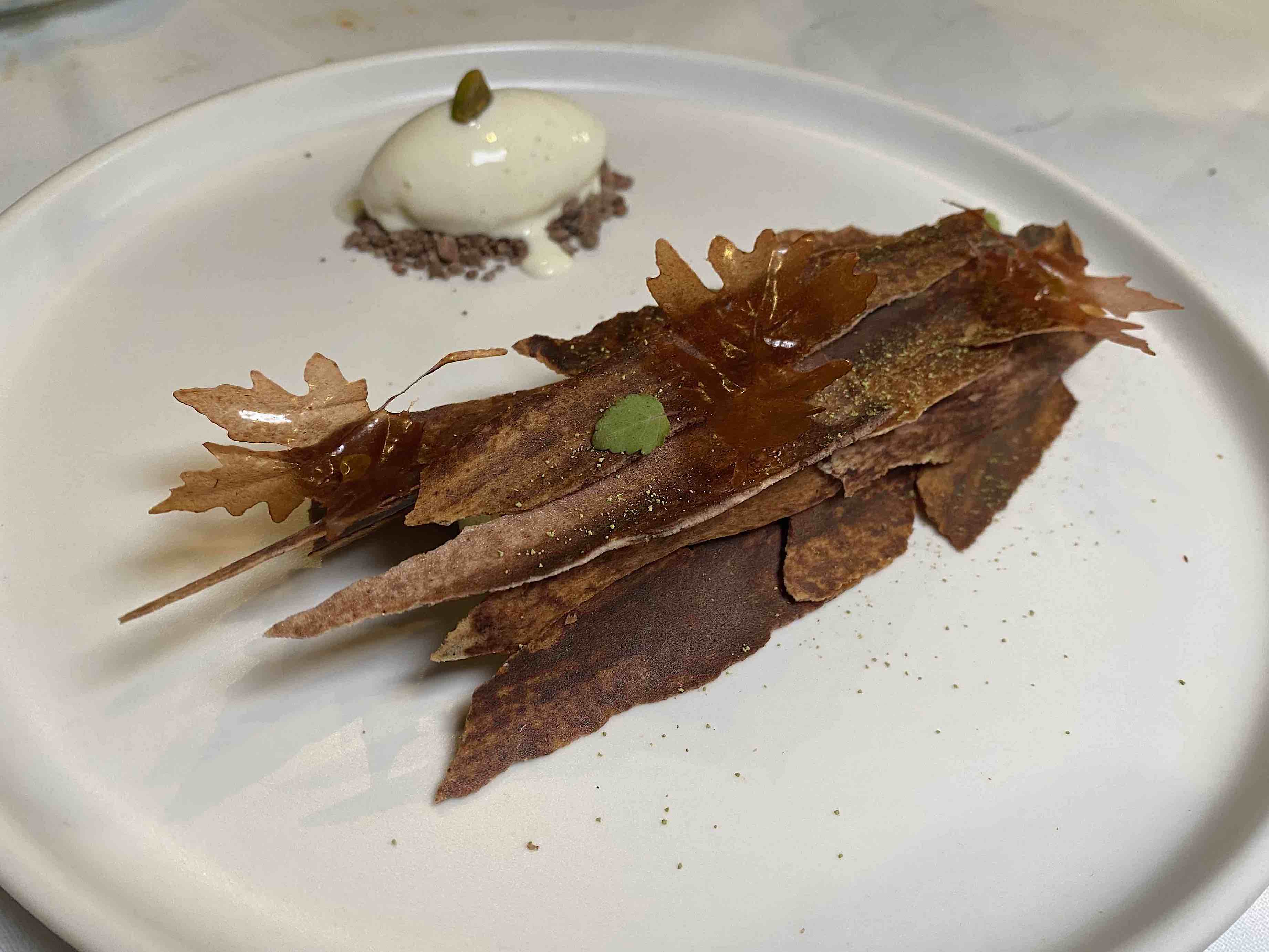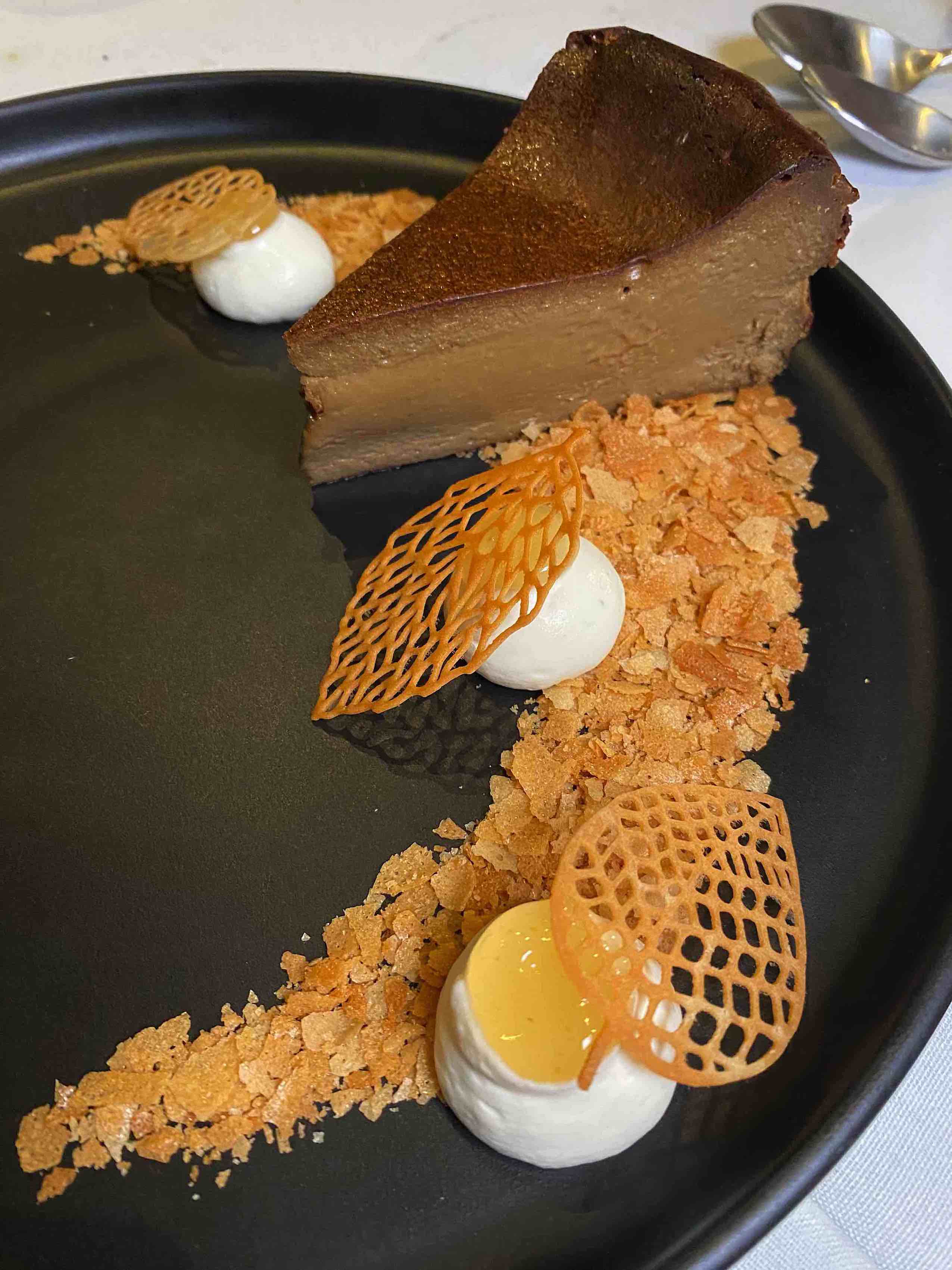焙茶巴斯克芝士蛋糕(houjicha cheesecake)內餡味道濃郁,帶有堅果及咖啡香氣,面層香脆中帶有蜜糖和焦糖的甜韻,甜度恰到好處,與preserved lemon yuzu gel完美融合,再加一球salted caramel gelato作為呼應。
