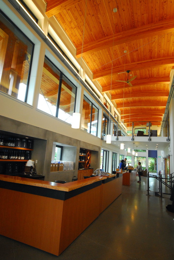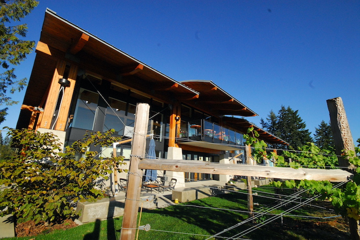 位於葡萄園中的Blue Grouse品酒室是一座雅致而帶太平洋西海岸建築風格的二層高木構建築物,帶著弦弧線條的屋頂,是倣效松雞項背的優美曲線,就連木材和石材的天然色調也呼應了松雞獨特的羽毛顏色,室內富現代感的簡潔設計,充分利用了朝南方位以俯瞰葡萄園及遠眺鬱鬱蔥蔥的起伏丘陵。無論是從貫穿整棟建築的露台、主門廳還是夾層,這座擁有大面積玻璃窗的美麗建築都能將美景盡收眼底。採用地熱能源和收集雨水循環再用的設計,都是本省酒莊中的環保先行者。