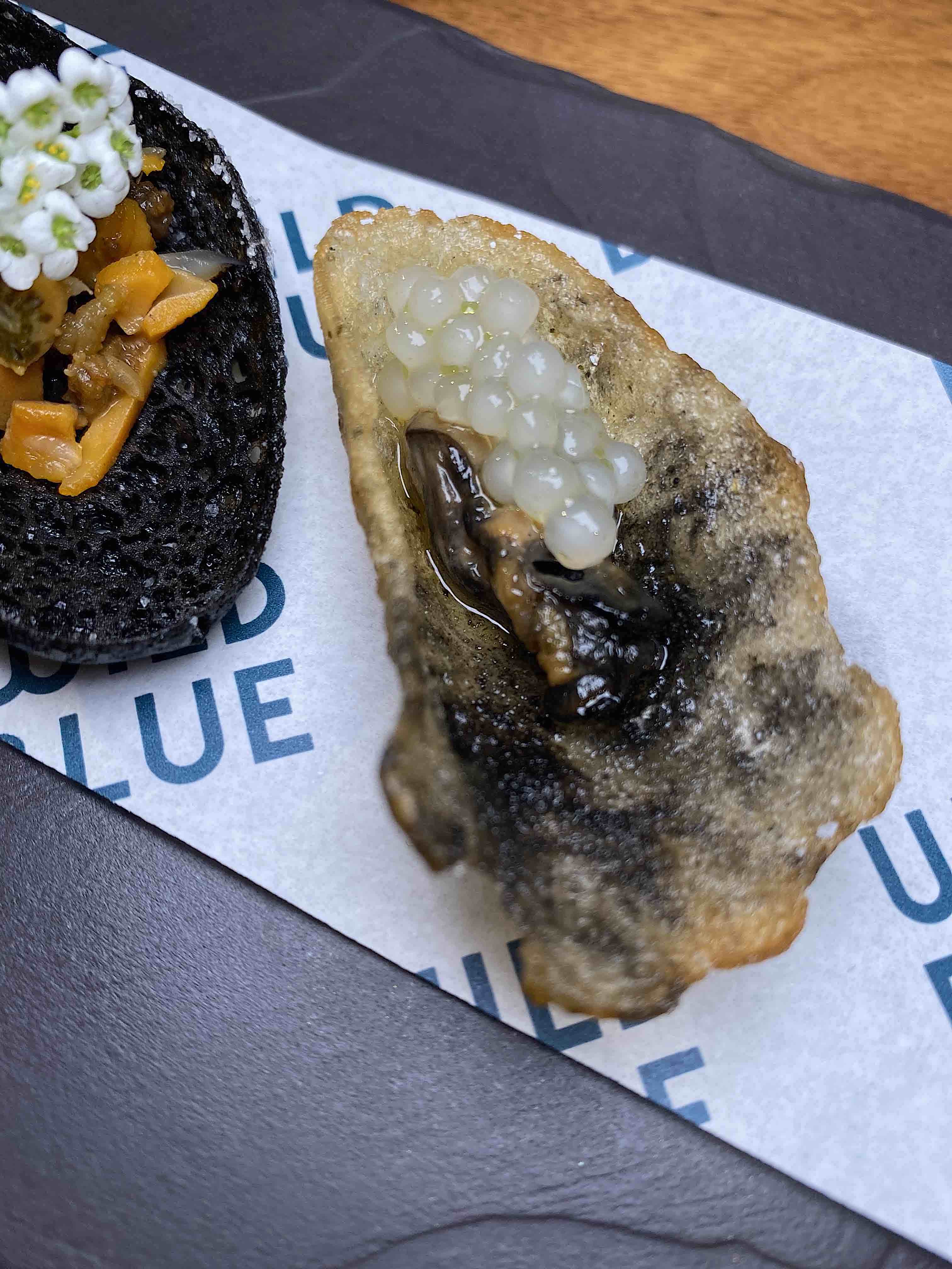 主廚以三款amuse bouche來為與會的一眾開胃。首款是smoked oyster,除了煙熏生蠔配醬汁脆粒的美妙口感之外,製成可食用「蠔殻」的設計,也為進食時的趣味加了分。