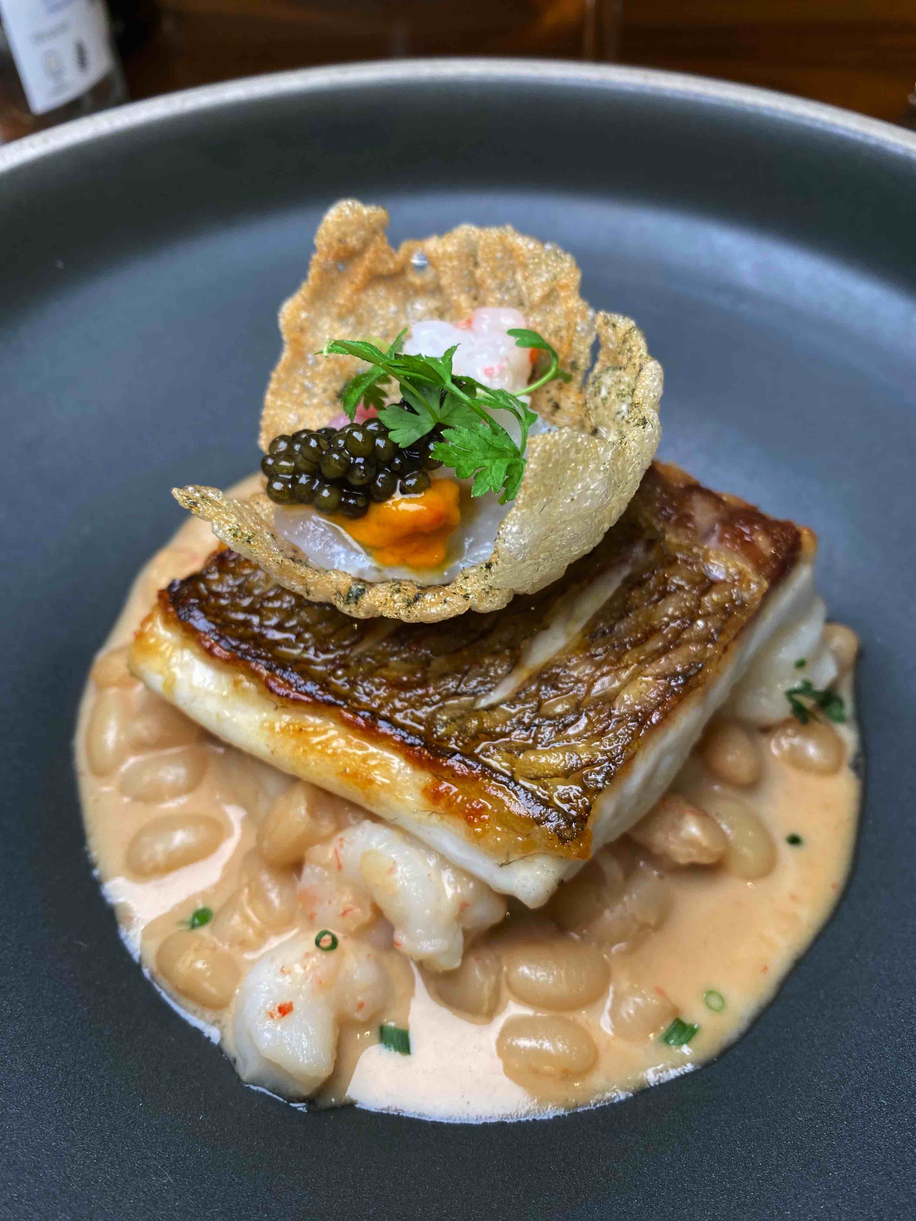 日本有許多種類的鯛魚(tai),例如黑鯛、金目鯛和青鯛,而紅色的真鯛(madai)通常被認為是品質最好的。瀨戶內海正是以真鯛在此生息及有強勁的潮汐漩渦而聞名。真鯛肉質緊實而且口味鮮嫩,以刺身形式食用最得真味。主廚則一魚兩吃,先把真鯛魚塊煎炙,配以加有煮白豆的shellfish fricasée,讓海鮮湯汁、白酒、香荽等風味烘托出真鯛那口感純淨的效果。另一食法是在魚塊上加了脆片,盛著一片真鯛刺身,少許雲丹及一把魚子醬締造豪華感。