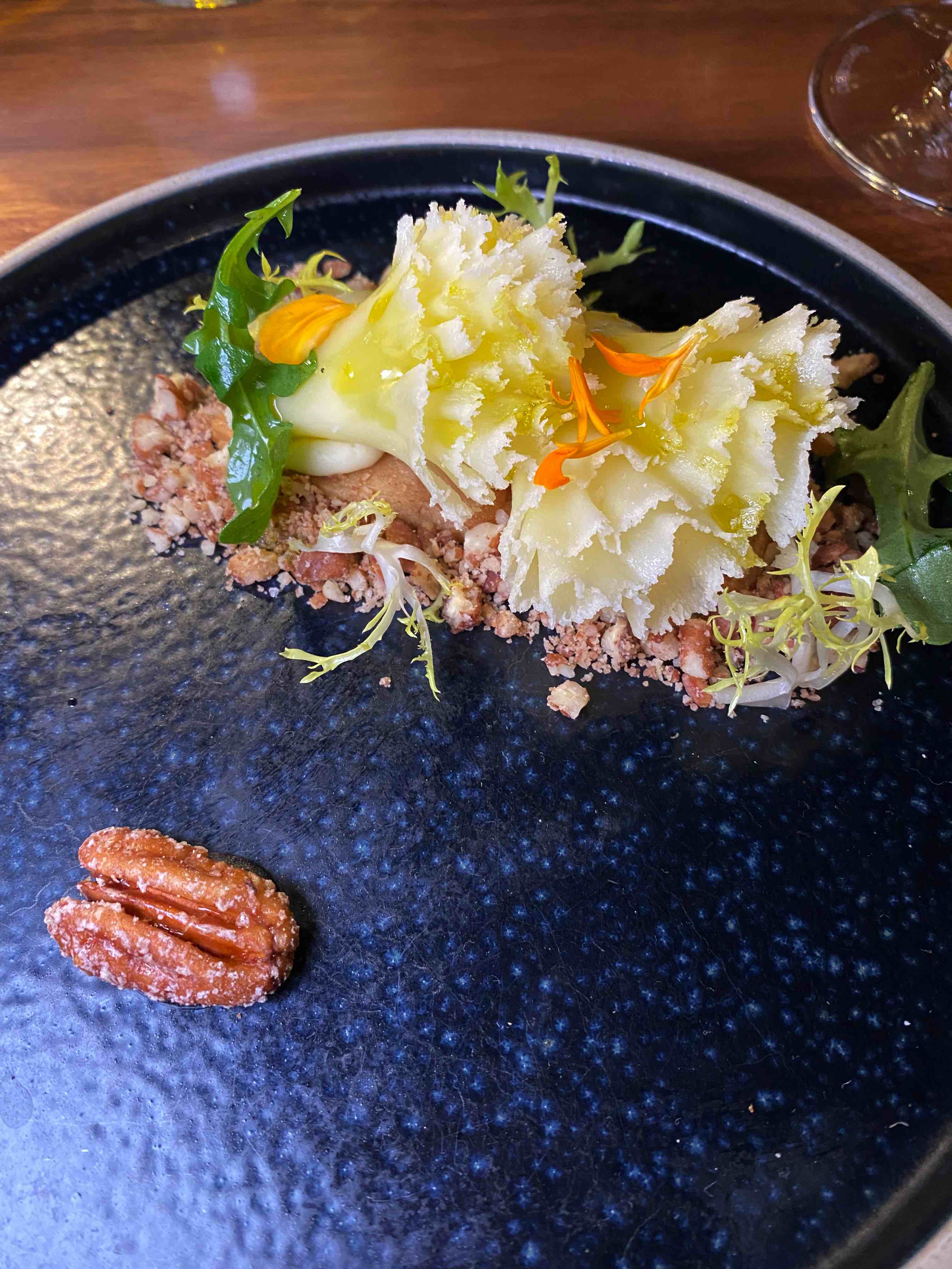 Tête de Moine是瑞士最有名的「僧侶頭」芝士,供應這款芝士的傳統手法,是以名為girolle的專用旋轉刨刀從芝士的圓柱形頂端一層一層地往下刨薄,讓其中的濃郁果香和甜味充分釋放,而且刨成的薄片在旋轉時自然地堆積成玫瑰花形,更添賣相。 這款Tête de Moine tarte還有縐葉苦苣(frisée)、榲桲(quince)粒粒及山核桃等配襯。
