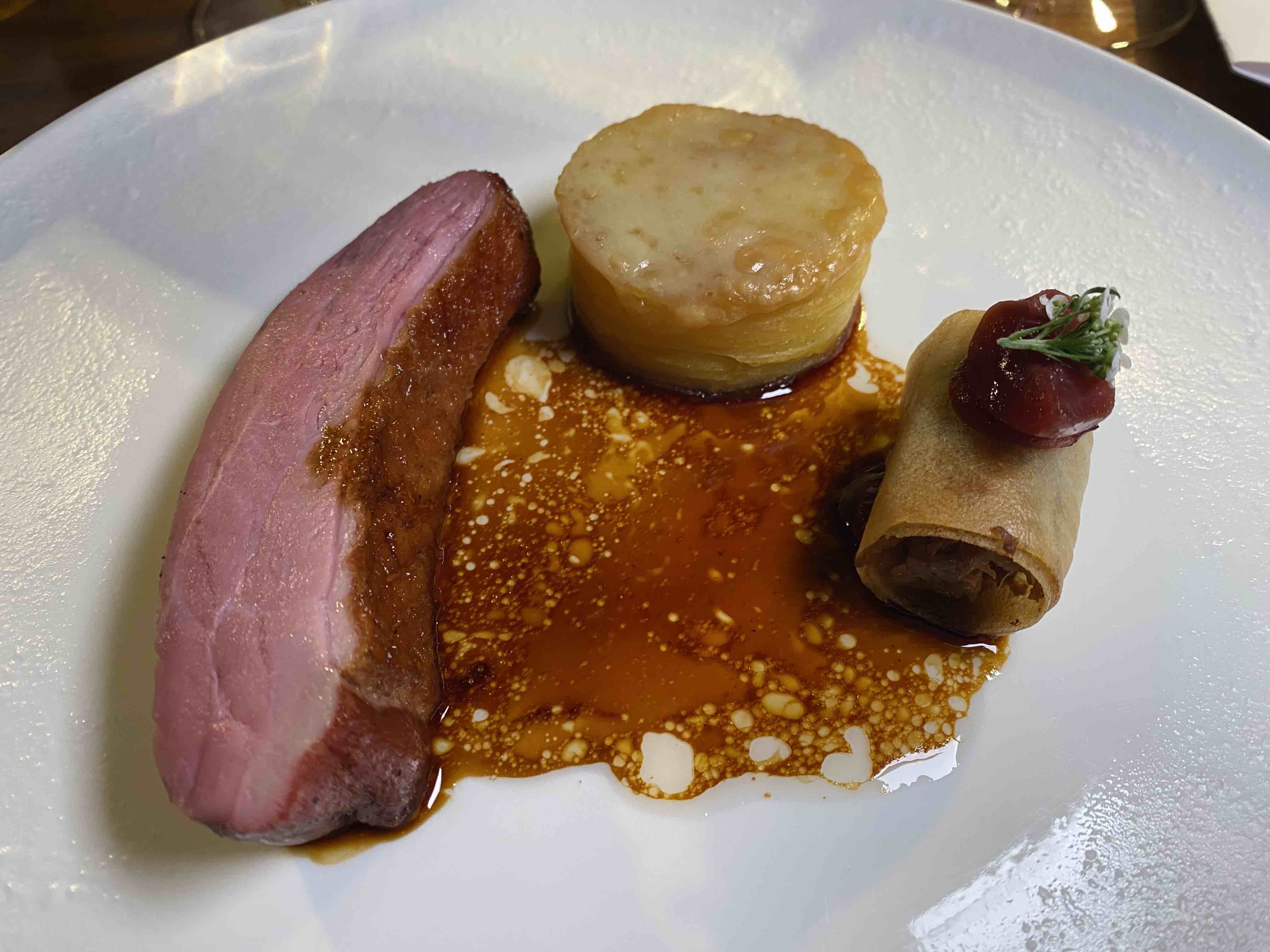 Fraser Valley duck breast展現鴨肉兩生花:鴨胸嫩煎至皮脆肉嫩,滋味的油封鴨腿肉則釀入小小肉卷之中,上置主攻解膩的酸漬櫻桃pickled cherry。最巧手是把一層層的薯塊堆疊成圓柱形的potato dauphinoise,鹹香的鴨汁為整道菜式提味增鮮。