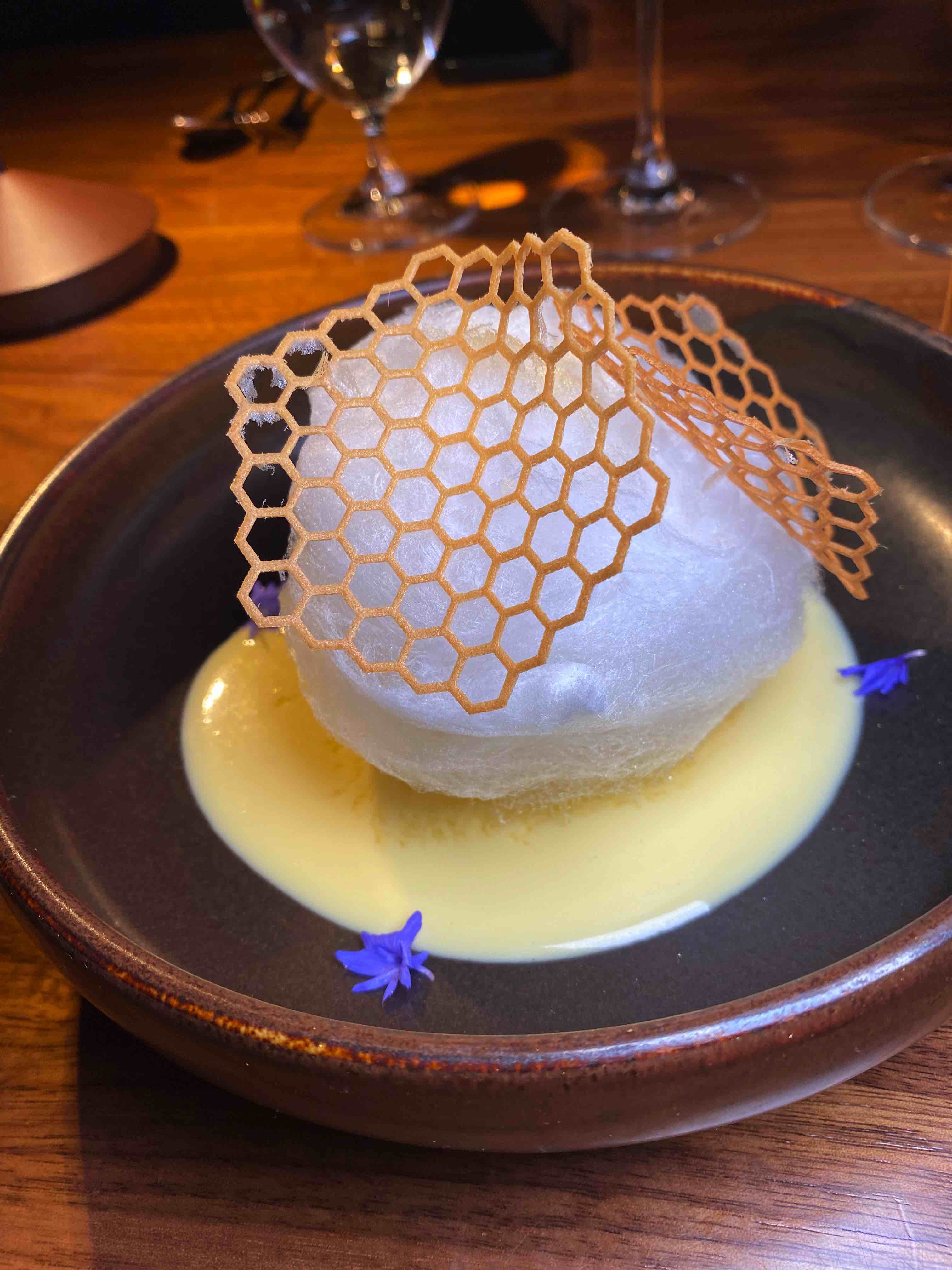 Yuzu and almond parfait cloud顏值擔當,甜香醬汁yuzu & elderflower crème anglaise之上是以棉花糖塑成的雲朵朵,掀起後展現真身:有以yuzu liqueur及sparkling water成的yuzu crémant、杏味海綿蛋糕及甜漬香梨粒粒。