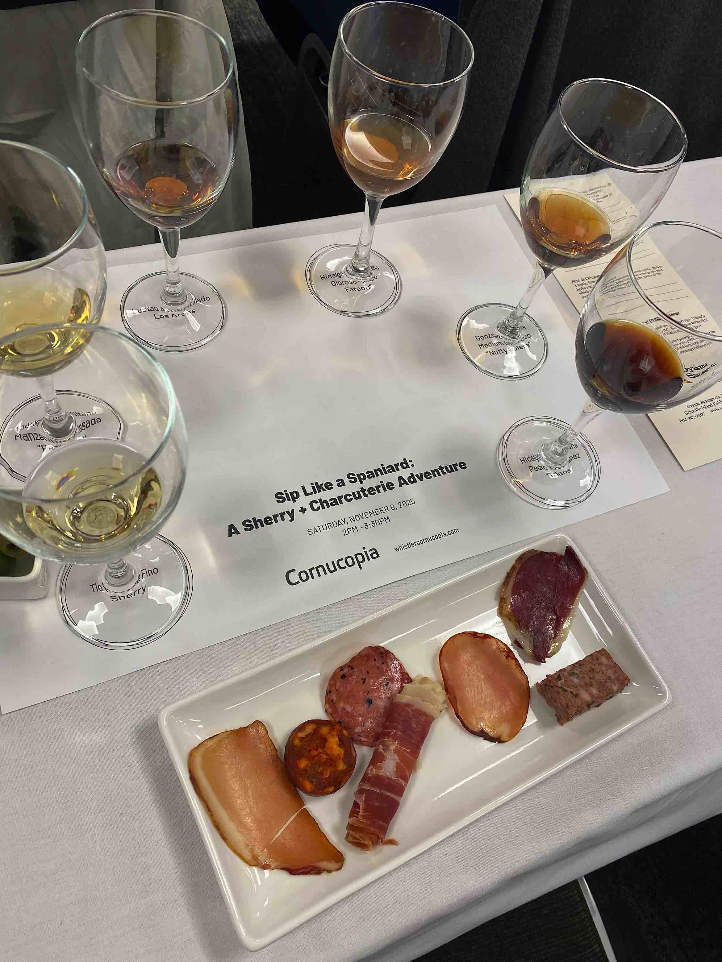 適逢國際雪莉酒周而舉行的品酒講座是“Sip Like a Spaniard: A Sherry and Charcuterie Adventure”,主持人是Keith Nicholson, Paul Watkin,還有來自Granville Island知名凍肉熟食攤Oyama Sausage Co.的Jerome Dudicourt 講解配對之樂,好讓你可以像西班牙人一樣品味雪莉酒與熟食配搭之道。