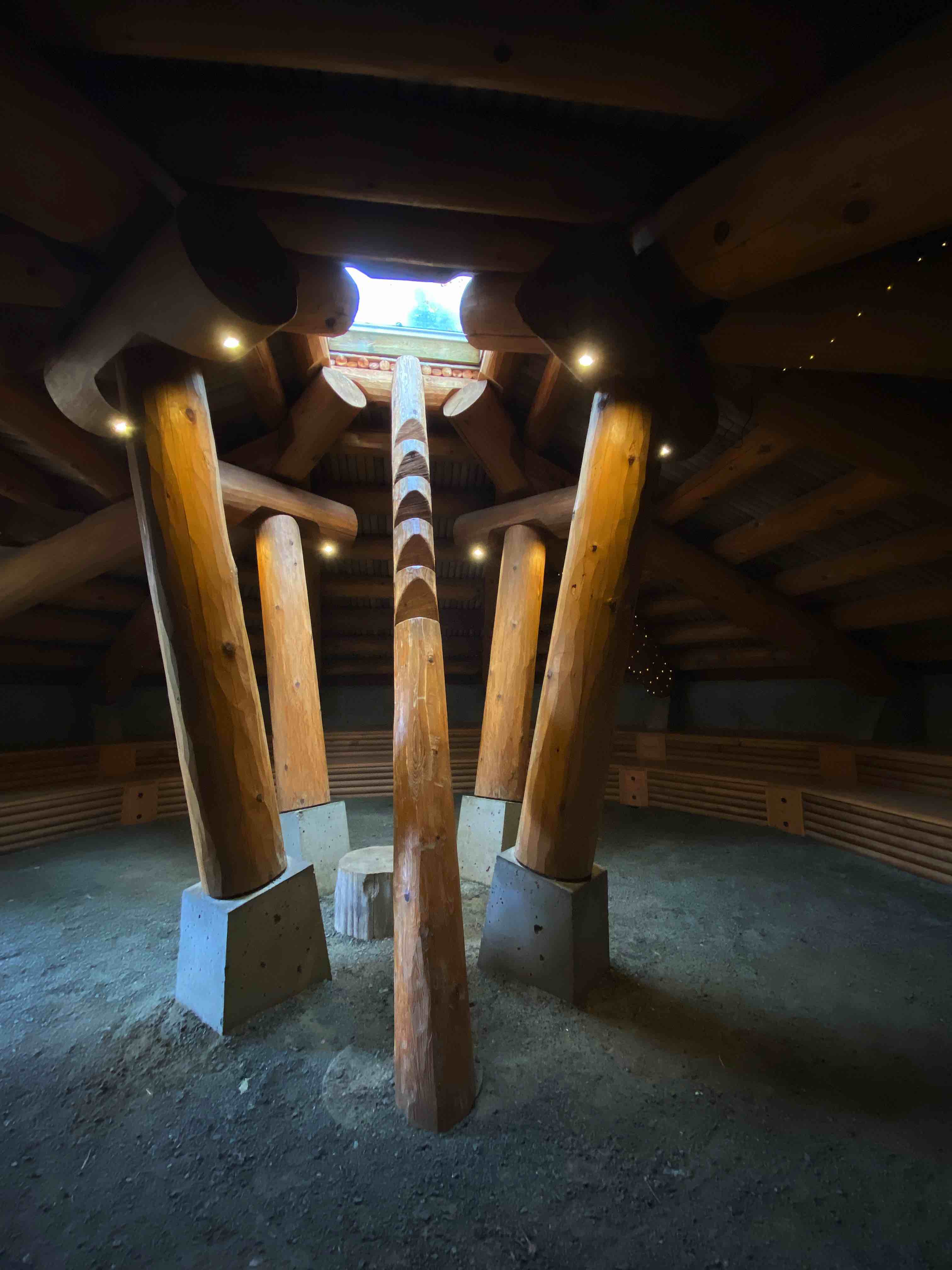 沿著步道,走進了原住民以前居住的pit house。這種地穴式小屋巧妙地偽裝使敵人難於發現,屋頂的開孔既是煙囪也是入口,雪松木梯是通往屋外的通道,最下面的幾級台階故意省略,這樣的話要是有敵人入侵也會驚動屋裡的人。