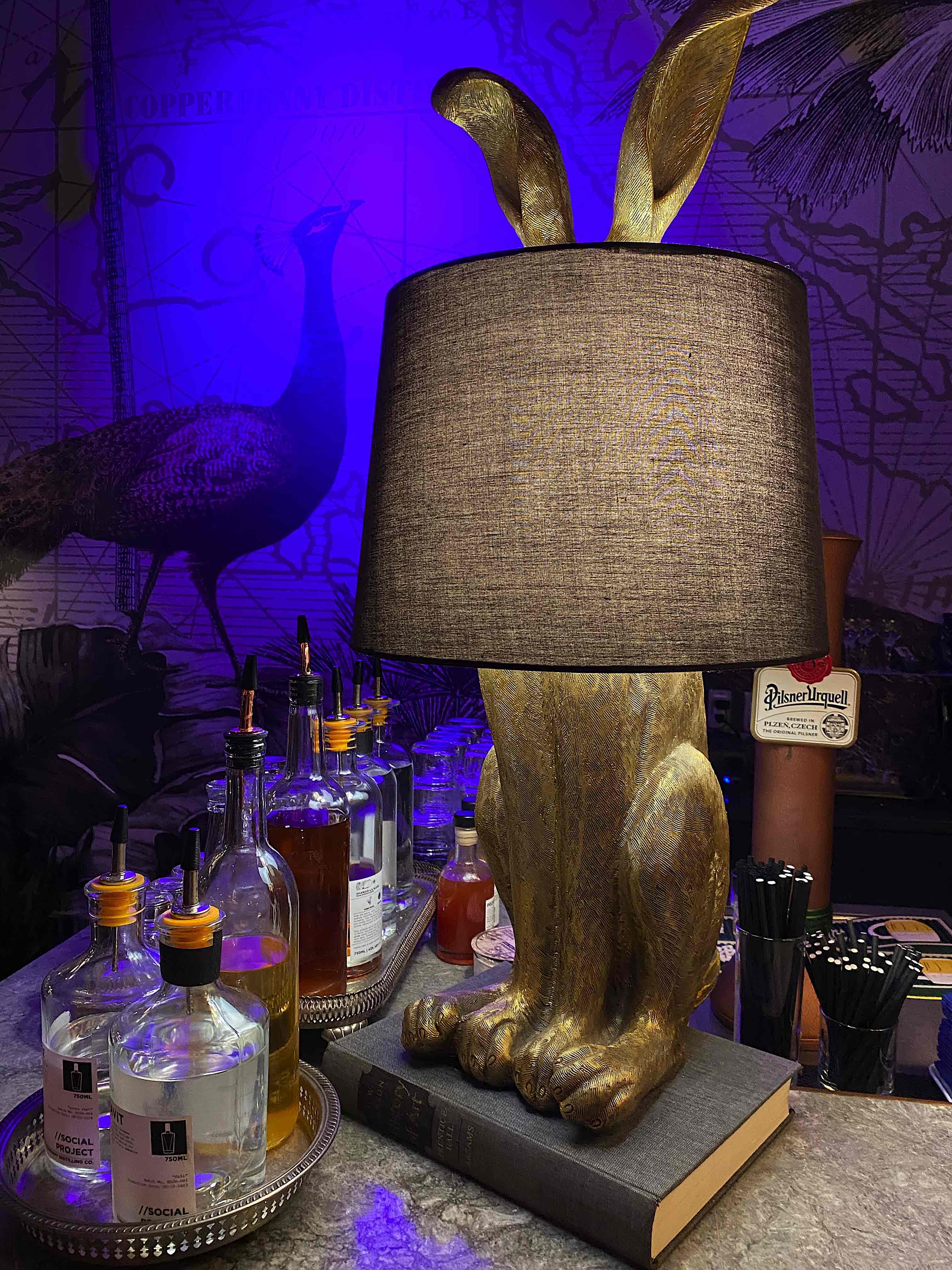 Copperpenny的酒吧以金色為主調,另一邊牆上有雙孔雀巨幅圖像,室內最引人注目飾品是一盞長耳兔造型金色檯燈,祖母綠和紫藍色調讓空間顯得華美而不落俗套,在燈色掩映下甚而帶點夢幻感。