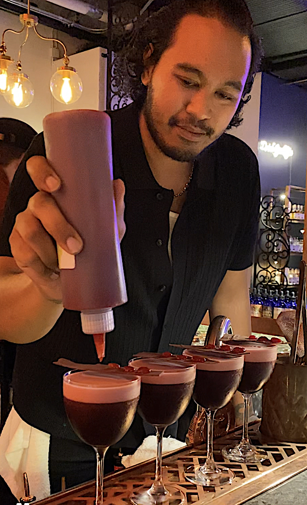 甜點配搭的雞尾酒“Reverie”用了No. 002 Premium Wheat Vodka為基酒,和Just-a-Sec、紅酒、漿果糖漿(berry cordial)、檸汁完美調配,再以苦精和順滑的純素泡沫加以提升,上綴一片加了點點莓果醬的巧克力作裝飾。