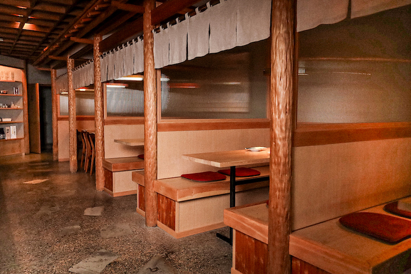 全新裝潢的室內設計以淺色系木材為主調,一邊是好幾間看似獨立間隔的包廂,由斜面玻璃隔板和木質背景牆隔開,營造出私密的空間感;另一邊是廚師操作的寬敞空間和一列壽司吧,讓坐在包廂的客人一樣可以欣賞到主廚的操刀手藝。餐廳的整體氛圍寧靜祥和,予人放鬆舒適的感覺。