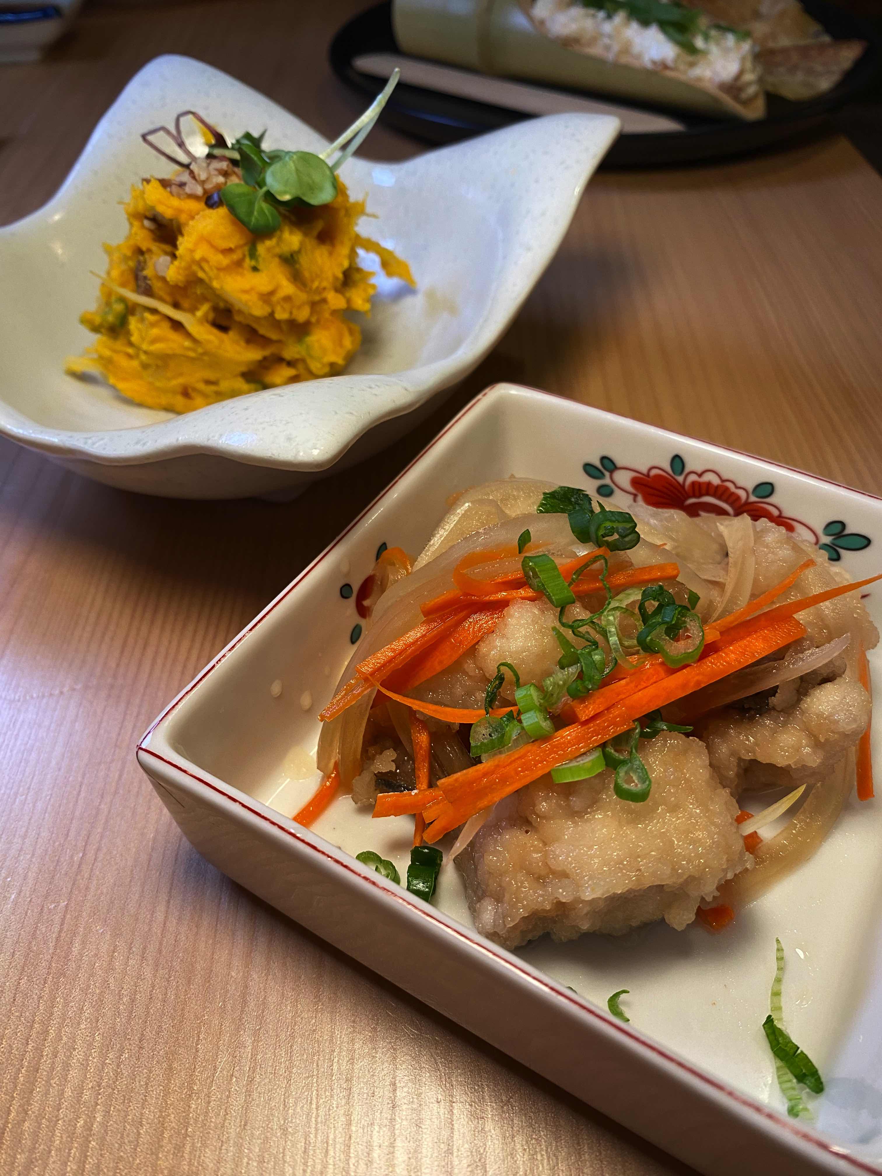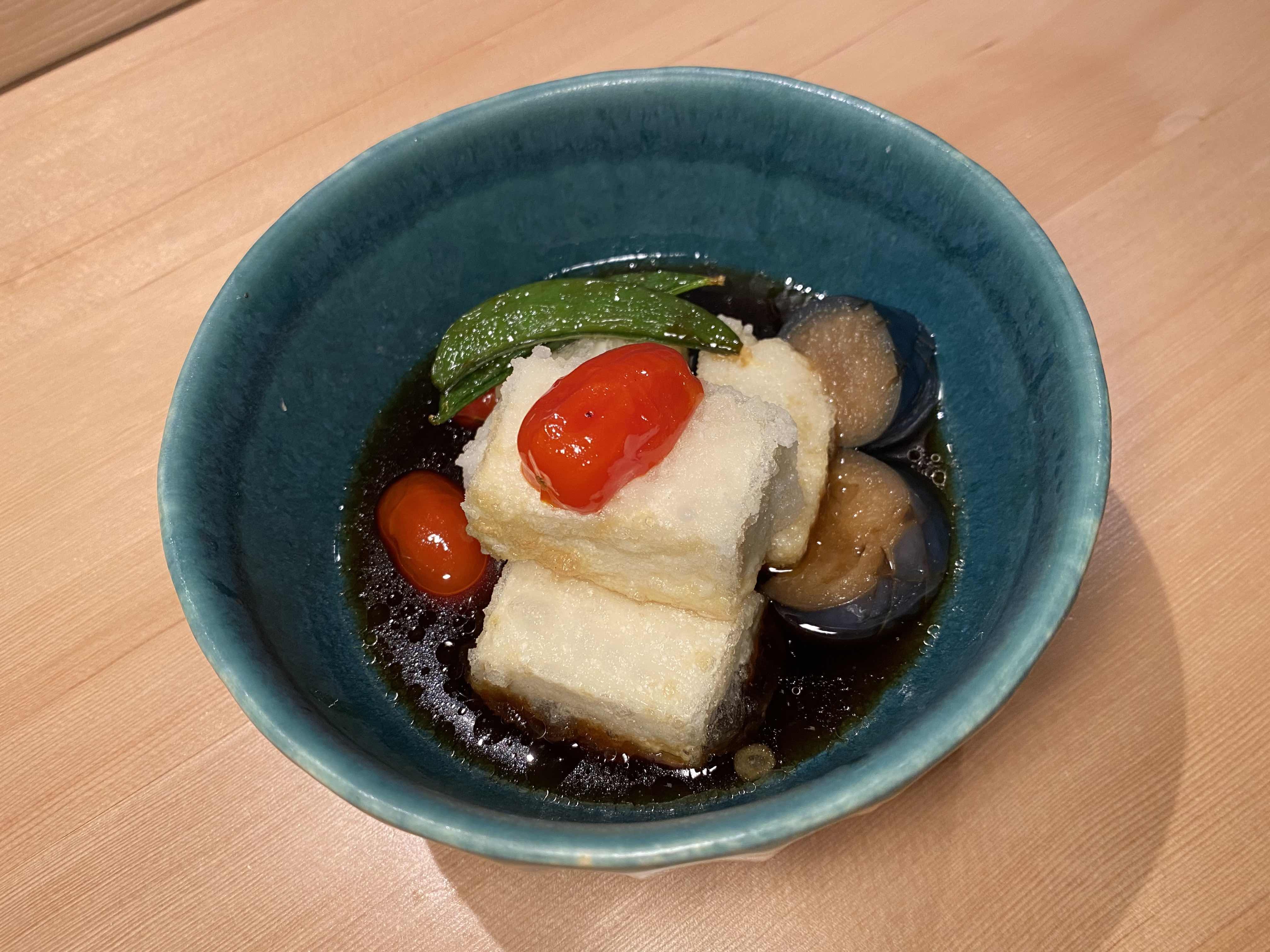 揚出豆腐(agedashi tofu)裹著的炸麵衣旣輕且薄,外酥內嫩,配搭加有茄子、櫻桃茄的鰹魚出汁,味道清鮮中帶微甜,剛可調和茄子押壽司的偏鹹。