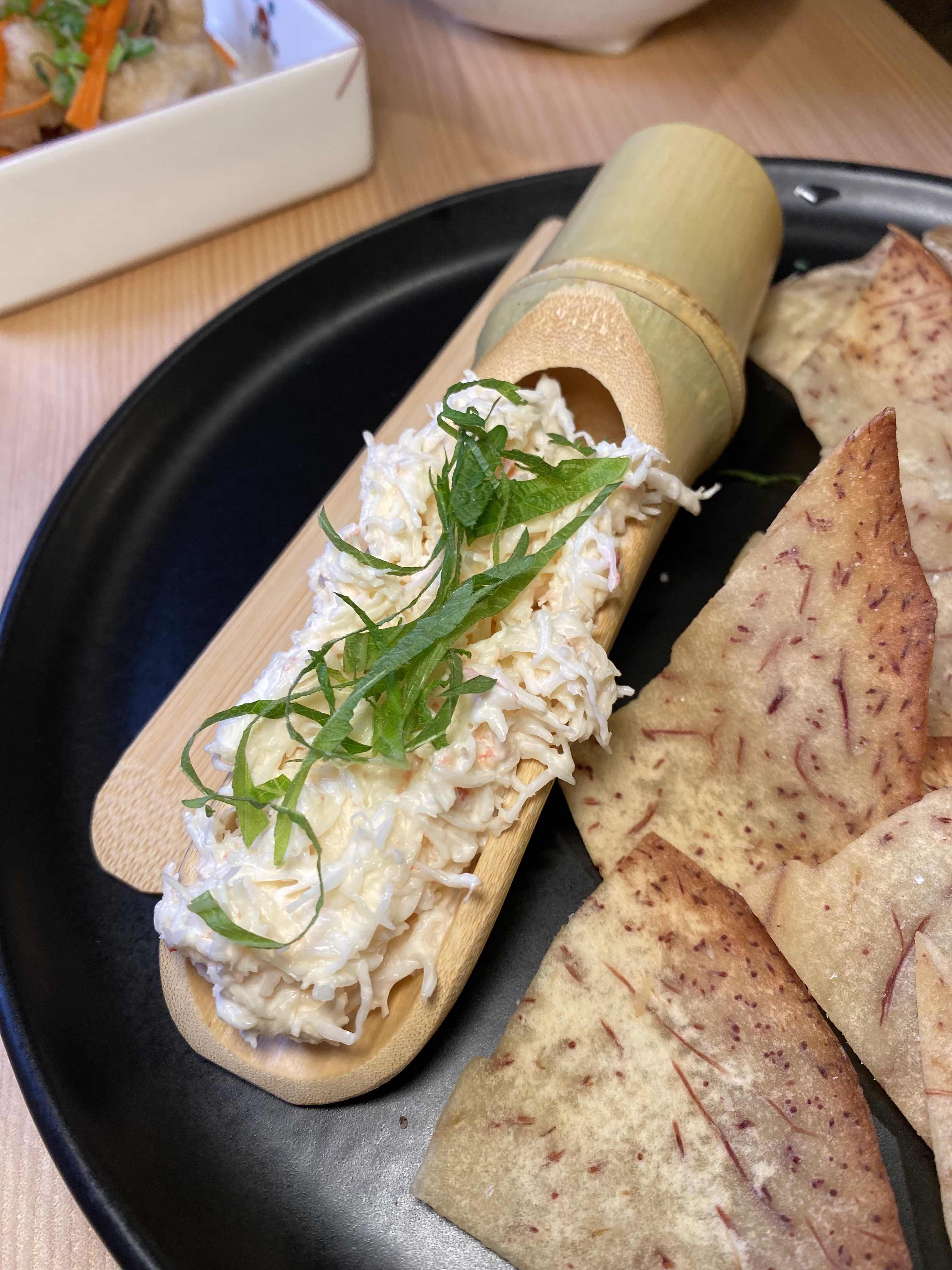 Hokkaido snow crab是令人印象深刻的海鮮前菜,北海道雪蟹肉混合了yuzu cream cheese,盛放在挖空的竹筒中,以酥脆的香芋片盛著來吃。這道菜食趣十足,是對傳統分享式開胃菜的創新演繹,濃郁的柚子芝士醬提升了雪蟹肉的鮮味,加上柚子令人垂涎的柑橘香氣十分突出,味道清新爽口,芋頭片酥脆輕盈,三者結合,相得益彰。