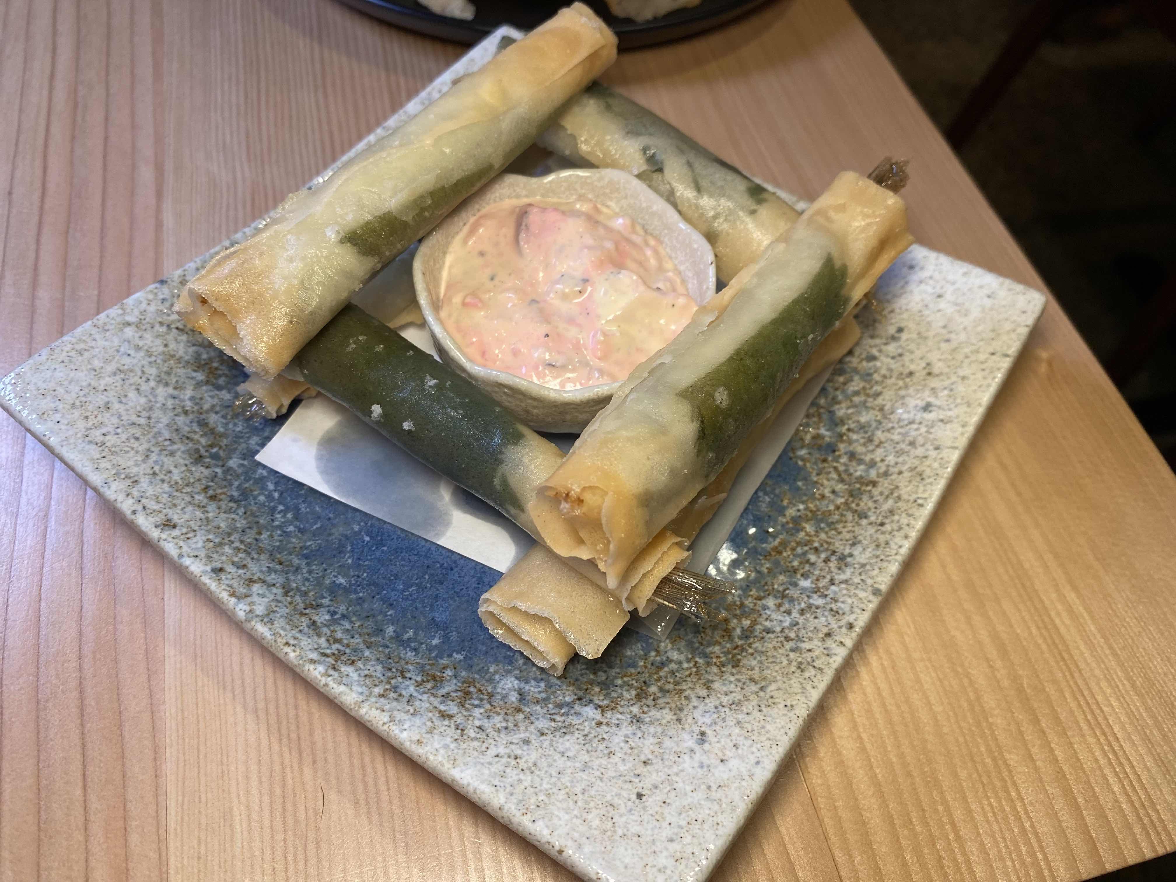Crispy shishamo harumaki就是柳葉魚春卷,柳葉魚(shishamo)為胡瓜魚(smelt)之屬,這種鹹水小魚形如柳葉,原產於日本北海道太平洋沿岸地區。在日本料理中,這種魚通常整條烤製或油炸,並保留魚卵食用。主廚把魚肉釀入細長春卷中炸香蘸沙律醬來吃,又是另一風味。