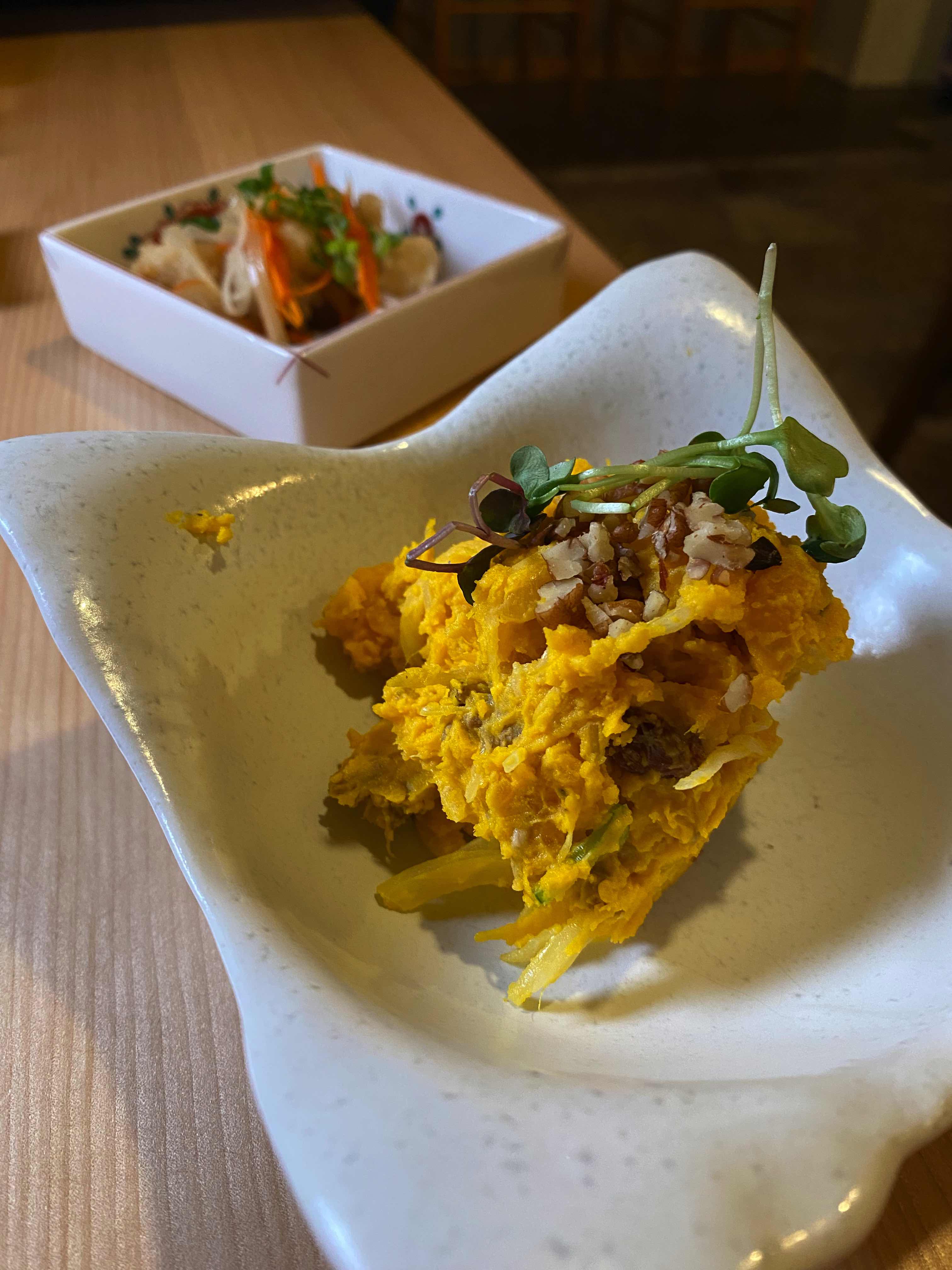 Wagyu Kabocha salad是我最欣賞的前菜,綿密香甜的煮日本南瓜絲裡揉雜著濃郁的和牛香甜,滋味可口。