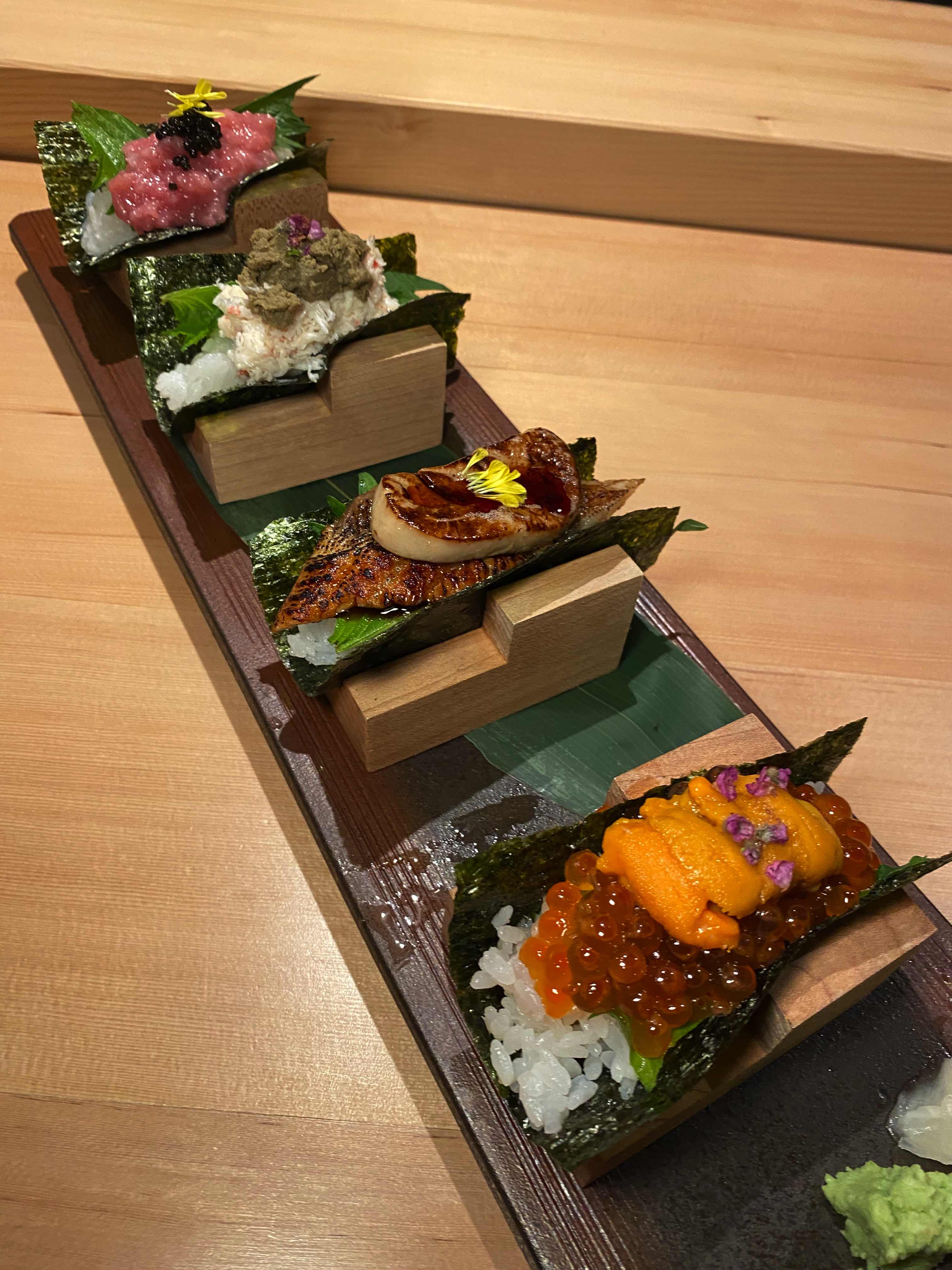 此間的temaki hand roll一款有五式,可以整套點叫或單點,這裡是: chutoro、snow crab、unagi with foie gras及inure & uni,另有一式是和牛。