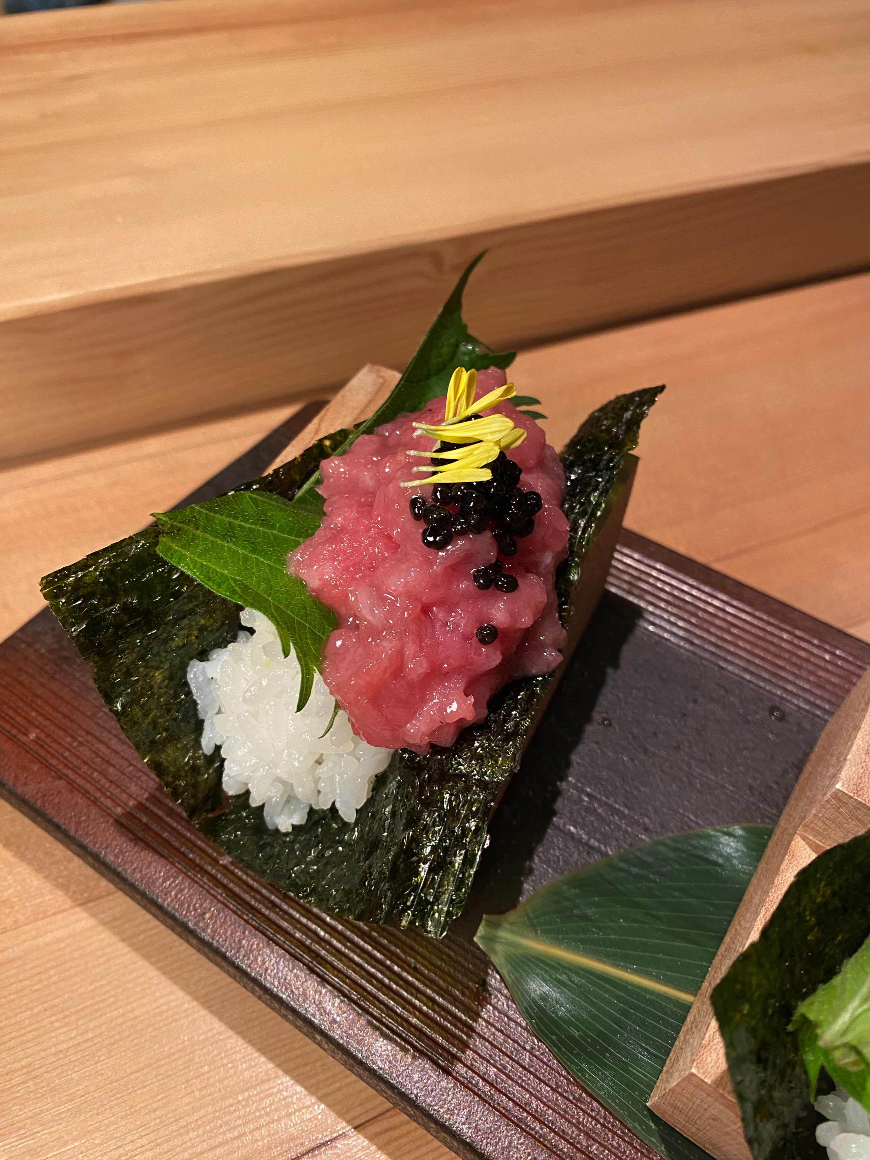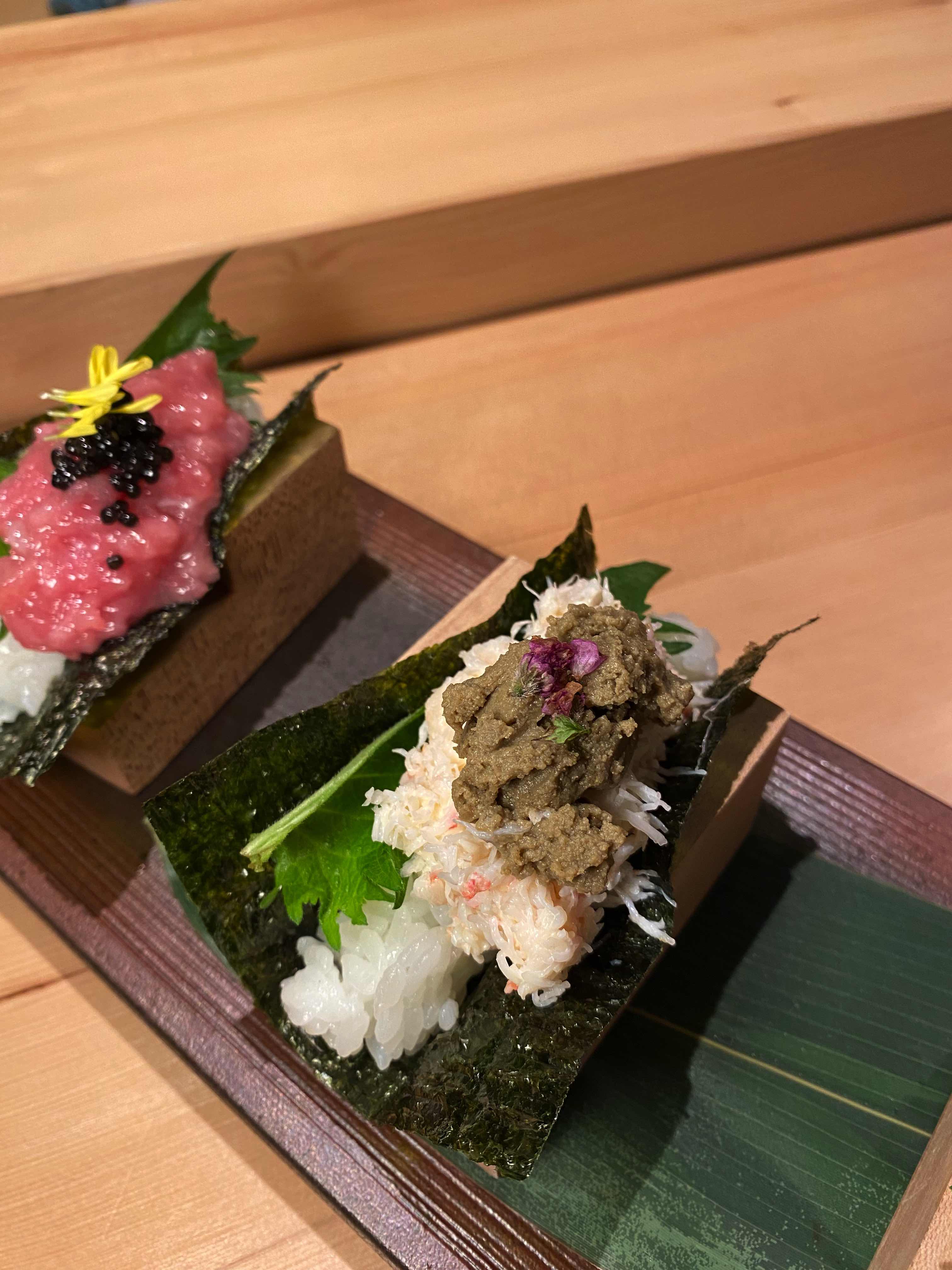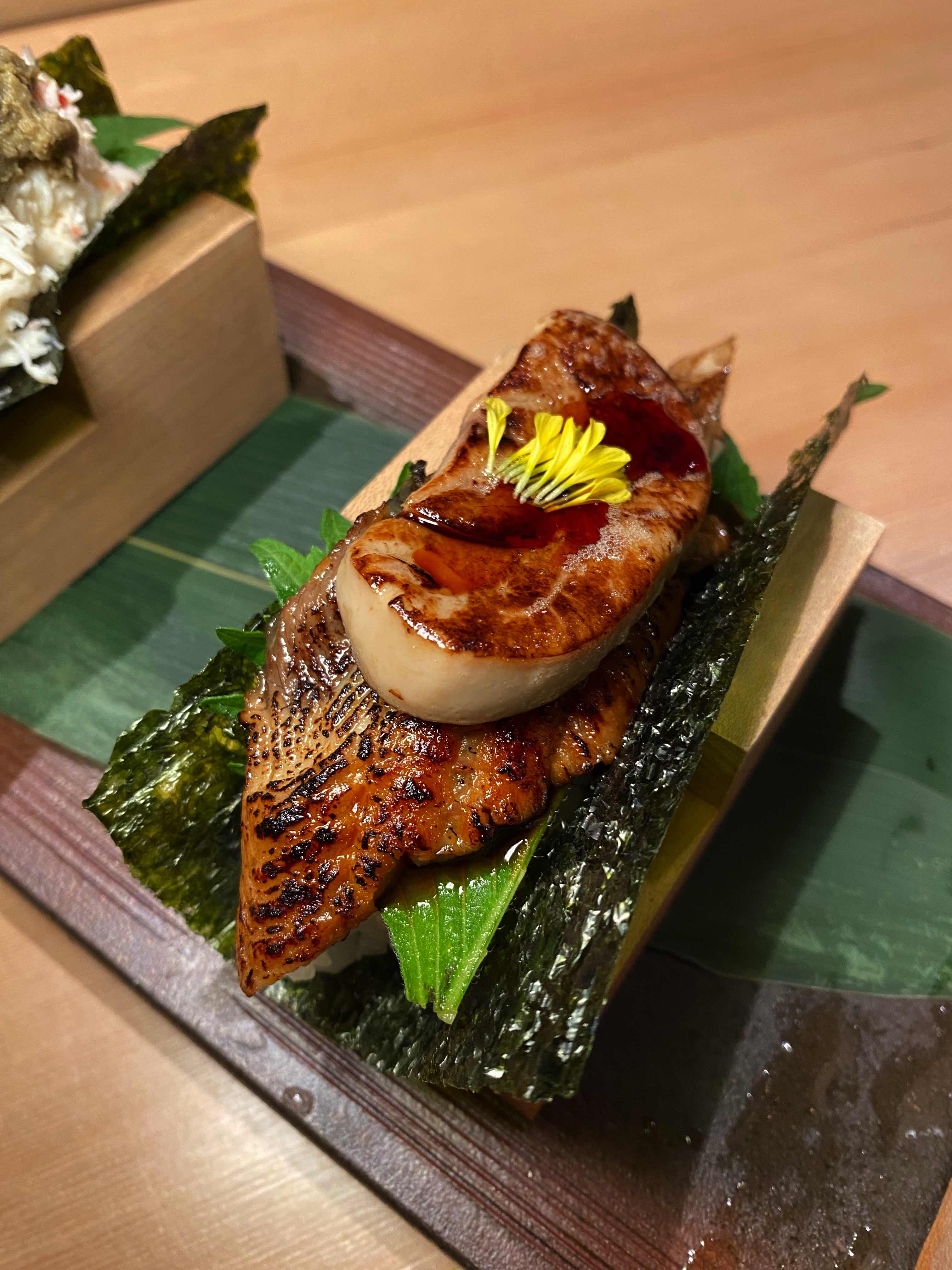 鰻魚和鵝肝的組合unagi with foie gras是另一奢華配搭,鹹香濃郁,鵝肝溢出油脂的豐沃綿密口感混和了醬汁,與鰻魚焦香中夾雜的鮮嫩配搭,風味更上層樓。少許紫蘇葉的提鮮,為這道豐盛油潤的手卷增添了一抹清新的草本氣息。