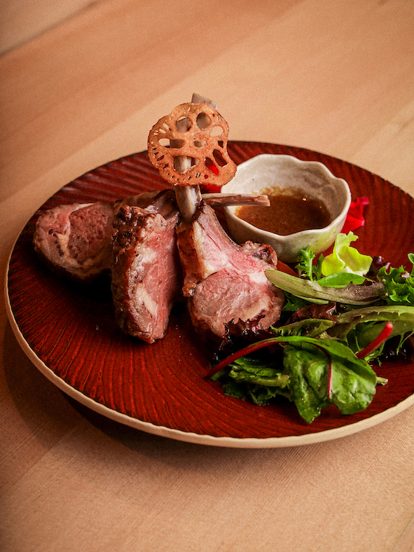 主菜New Zealand lamb rack是取紐西蘭羊排低溫慢煮,肉質嫩滑,佐以薑汁醬油並綴上炸蓮藕及沙律菜。